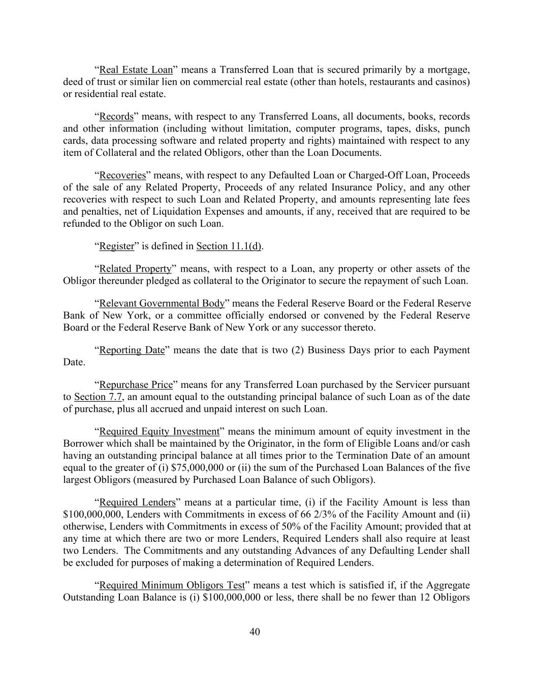 “房地产贷款”是指主要以商业房地产(酒店、餐饮和赌场除外)或住宅房地产的抵押、信托契约或类似留置权为担保的转让贷款。“记录”是指,就任何转让的贷款而言,除贷款文件外,就任何担保物和相关义务人保持的所有文件、簿册、记录和其他信息(包括但不限于计算机程序、磁带、磁盘、打孔卡、数据处理软件及相关财产和权利)。“追偿”是指,就任何违约贷款或核销贷款而言,出售任何相关财产的收益、任何相关保单的收益,以及与该贷款和相关财产有关的任何其他追偿,以及代表滞纳金和罚款的金额,扣除清算费用和收到的要求就该贷款向债务人退还的金额(如有)。“注册”在第11.1(d)节中定义。“相关财产”是指,就贷款而言,作为担保物质押给发起人以担保偿还该贷款的债务人的任何财产或其他资产。“相关政府机构”是指美国联邦储备委员会或纽约联邦储备银行,或由美国联邦储备委员会或纽约联邦储备银行或其任何继任者正式认可或召集的委员会。“报告日”是指每个付款日期前两(2)个工作日的日期。“回购价格”是指服务商根据第7.7条购买的任何已转让贷款,金额等于截至购买之日该贷款的未偿本金余额,加上该贷款的所有应计和未付利息。“所需股权投资”是指应由发起人维持的对借款人的最低股权投资金额,形式为符合条件的贷款和/或在终止日期之前所有时间均有未偿本金余额的现金,金额等于(i)75,000,000美元或(ii)五个最大债务人的已购买贷款余额之和(以这些债务人的已购买贷款余额衡量)中的较高者。“被要求贷款人”是指在特定时间,(i)如果融资金额低于100,000,000美元,承诺金额超过融资金额的662/3%的贷款人,以及(ii)否则,承诺金额超过融资金额50%的贷款人;但在有两个或更多贷款人的任何时间,被要求贷款人也应要求至少两个贷款人。为确定所需贷款人,应排除任何违约贷款人的承诺和任何未偿还的预付款。“必要的最低债务人测试”是指满足的测试,如果未偿贷款余额总额为(i)100,000,000美元或以下,则应有不少于12个债务人40