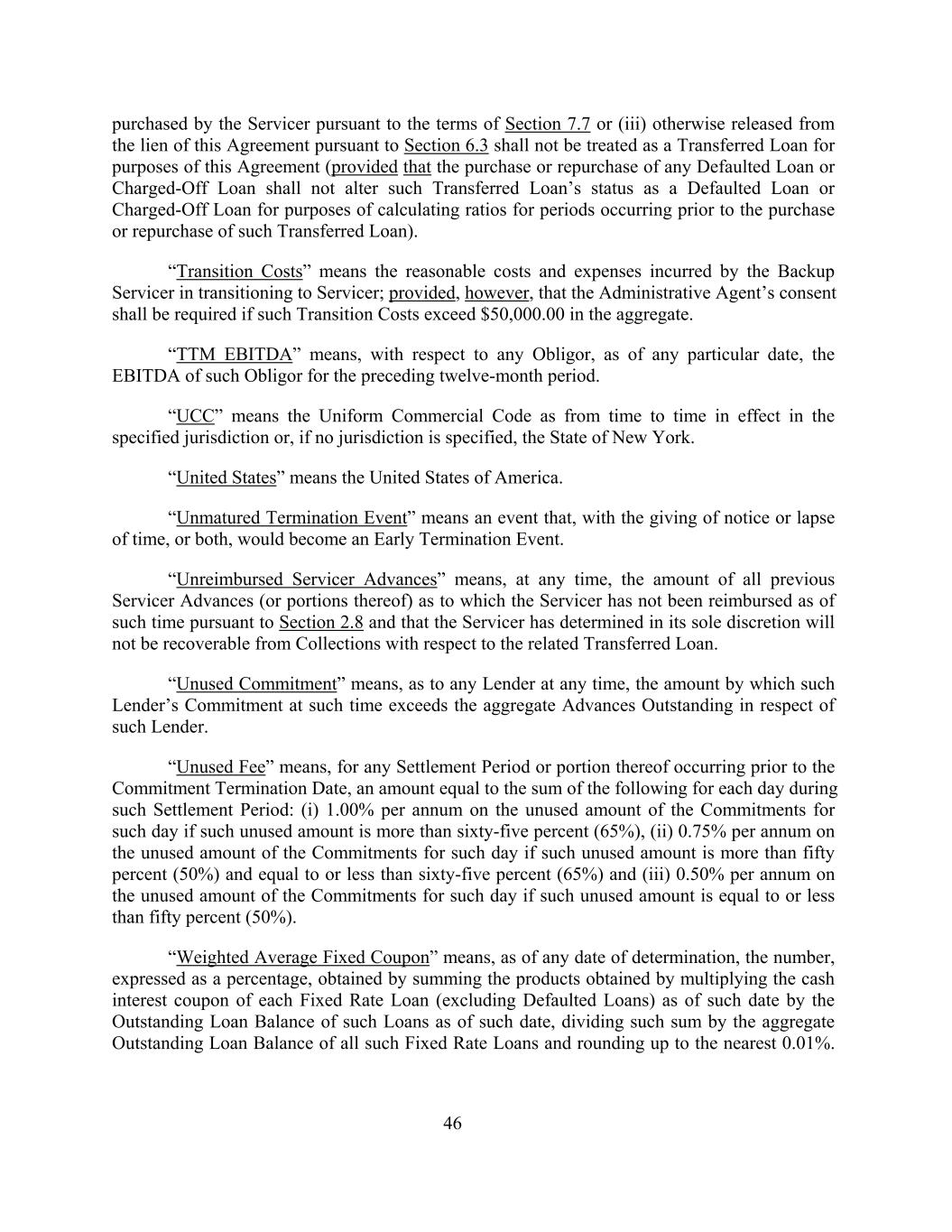 由服务商根据第7.7节的条款购买或(iii)以其他方式根据第6.3节解除本协议的留置权,就本协议而言,不应被视为转让贷款(前提是购买或回购任何违约贷款或已注销贷款不得改变此类转让贷款作为违约贷款或已注销贷款的地位,以便计算在购买或回购此类转让贷款之前发生的期间的比率)。“过渡费用”是指备份服务商在过渡到服务商过程中产生的合理成本和费用;但前提是,如果此类过渡费用总额超过50,000.00美元,则需要行政代理人的同意。“TTM EBITDA”就任何债务人而言,是指截至任何特定日期,该债务人在前十二个月期间的EBITDA。“UCC”是指在指定司法管辖区或(如未指定司法管辖区)纽约州不时生效的统一商法典。“美国”是指美利坚合众国。“未成熟终止事件”是指随着通知的发出或时间的推移,或两者兼而有之,将成为提前终止事件的事件。“未偿还的服务商垫款”是指,在任何时候,截至该时间,根据第2.8节,服务商尚未得到偿还的所有先前的服务商垫款(或其部分)的金额,并且该服务商已自行决定将无法从相关转让贷款的收款中收回。“未使用承诺”是指,对于任何贷款人在任何时候,该贷款人在该时间的承诺超过该贷款人的未偿还预付款总额的金额。“未使用费用”是指,对于在承诺终止日期之前发生的任何结算期或其部分,在该结算期内每一天的金额等于以下各项之和的金额:(i)如果该未使用金额超过百分之六十五(65%),则在该日的承诺未使用金额上每年收取1.00%,(ii)如该等未使用金额超过百分之五十(50%)且等于或少于百分之六十五(65%),则按该等日的承诺未使用金额每年0.75%;如该等未使用金额等于或少于百分之五十(50%),则按该等日的承诺未使用金额每年0.50%。“加权平均固定息票”是指,截至任何确定日期,通过将截至该日期的每笔固定利率贷款(不包括违约贷款)的现金息票乘以截至该日期该等贷款的未偿还贷款余额,再除以所有该等固定利率贷款的未偿还贷款余额总和并四舍五入至最接近的0.01%所得的数量,以百分比表示。46