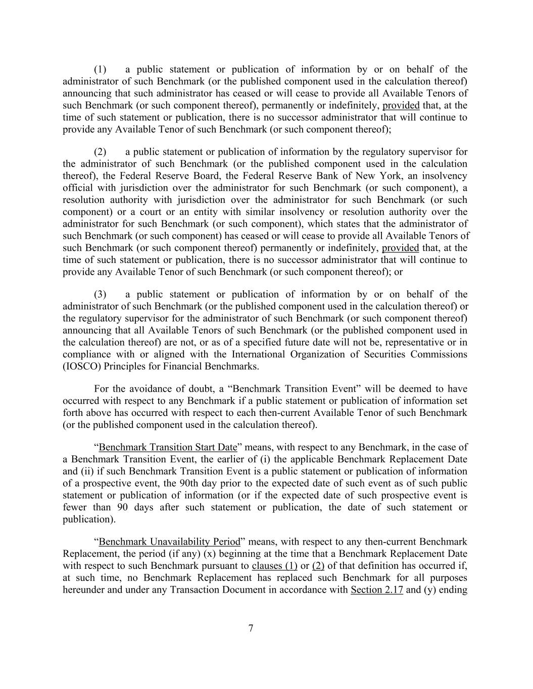 (1)由或代表该基准的管理人(或计算该基准所使用的已公布组件)发表的公开声明或公布信息,宣布该管理人已永久或无限期地停止或将停止提供该基准(或其该组件)的所有可用期限,但在该声明或公布时,没有继任管理人将继续提供此类基准(或其此类组成部分)的任何可用期限;(2)监管主管为此类基准(或其计算中使用的已公布组成部分)的管理人、联邦储备委员会、纽约联邦储备银行、对此类基准(或此类组成部分)的管理人具有管辖权的破产官员公开声明或公布信息,对这类基准(或这类组成部分)的管理人具有管辖权的解决机构或对这类基准(或这类组成部分)的管理人具有类似破产或解决权限的法院或实体,其中规定,这类基准(或这类组成部分)的管理人已停止或将停止永久或无限期地提供这类基准(或其这类组成部分)的所有可用期限,但条件是,在这类声明或公布时,没有继任管理人将继续提供此类基准(或其此类组成部分)的任何可用期限;或(3)由此类基准(或其计算中使用的已发布组成部分)的管理人或代表该基准(或其计算中使用的已发布组成部分)的管理人或该基准(或其此类组成部分)的监管主管发表公开声明或发布信息,宣布此类基准(或其计算中使用的已发布组成部分)的所有可用期限均不是,或截至指定的未来日期将不是,代表或符合或符合国际证监会组织(IOSCO)金融基准原则。为免生疑问,如果就该基准的每个当时可用期限(或计算该期限时使用的已公布部分)发生了上述公开声明或信息的公布,则将被视为就任何基准发生了“基准过渡事件”。“基准过渡开始日期”是指,就任何基准而言,在基准过渡事件的情况下,(i)适用的基准替换日期和(ii)如果该基准过渡事件是公开声明或发布预期事件的信息,则在该事件的预期日期之前的第90天(或如果该预期事件的预期日期在该声明或发布后少于90天,则为该声明或发布的日期)中较早者。“基准不可用期间”是指,就任何当时的基准替换而言,自根据该定义第(1)或(2)条就该基准而言的基准替换日期发生之时开始的期间(如有)(x),如果当时没有任何基准替换根据第2.17和(y)节为本协议项下和任何交易文件项下的所有目的替换该基准,截至7