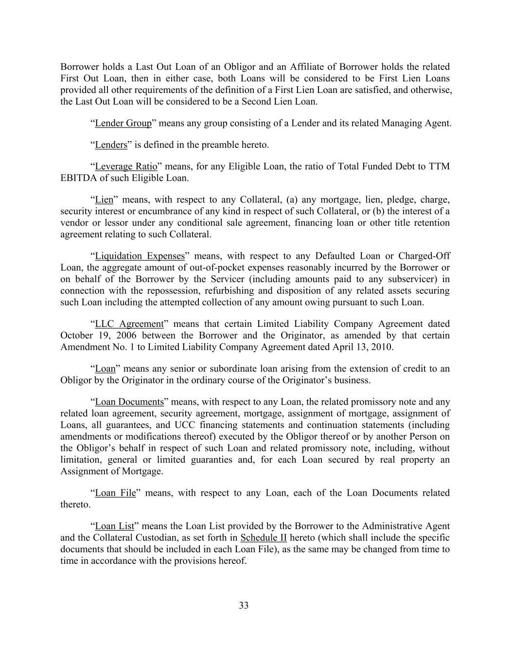 借款人持有债务人的最后一笔贷款,而借款人的关联公司持有相关的先出贷款,那么在任何一种情况下,只要满足第一留置权贷款定义的所有其他要求,这两笔贷款都将被视为第一留置权贷款,否则,最后一笔贷款将被视为第二留置权贷款。“出借人集团”是指由出借人及其相关管理代理组成的任何集团。“出借人”的定义见本协议序言部分。“杠杆率”是指,对于任何符合条件的贷款,已融资的总债务与此类符合条件贷款的TTM EBITDA的比率。“留置权”就任何抵押品而言,是指(a)与该抵押品有关的任何抵押、留置权、质押、押记、担保权益或任何种类的产权负担,或(b)卖方或出租人根据与该抵押品有关的任何有条件销售协议、融资贷款或其他所有权保留协议所享有的权益。“清算费用”是指,就任何违约贷款或已核销贷款而言,借款人或由服务商代表借款人合理承担的自付费用总额(包括支付给任何分服务商的金额),与收回、翻新和处置为此类贷款提供担保的任何相关资产有关,包括试图收取根据此类贷款所欠的任何金额。“有限责任公司协议”是指借款人与发起人于2006年10月19日签订的某些有限责任公司协议,经2010年4月13日对有限责任公司协议的第1号修订。“贷款”是指在发起人正常经营过程中,因发起人向债务人提供信贷而产生的任何高级或次级贷款。“贷款文件”指,就任何贷款而言,相关的本票和任何相关的贷款协议、担保协议、抵押、抵押的转让、贷款的转让、所有担保,以及由其债务人或由另一人代表债务人就该等贷款和相关本票签立的UCC融资报表和延续报表(包括其修订或修改),包括但不限于一般或有限担保,以及就每笔以不动产作担保的贷款而言的抵押转让。“贷款档案”是指,就任何贷款而言,与之相关的每一份贷款文件。“借款清单”是指借款人按照本协议附表二的规定,向行政代理人和抵押物托管人提供的借款清单(其中应包括每一借款档案中应包括的具体文件),该清单可能会根据本协议的规定不时更改。33