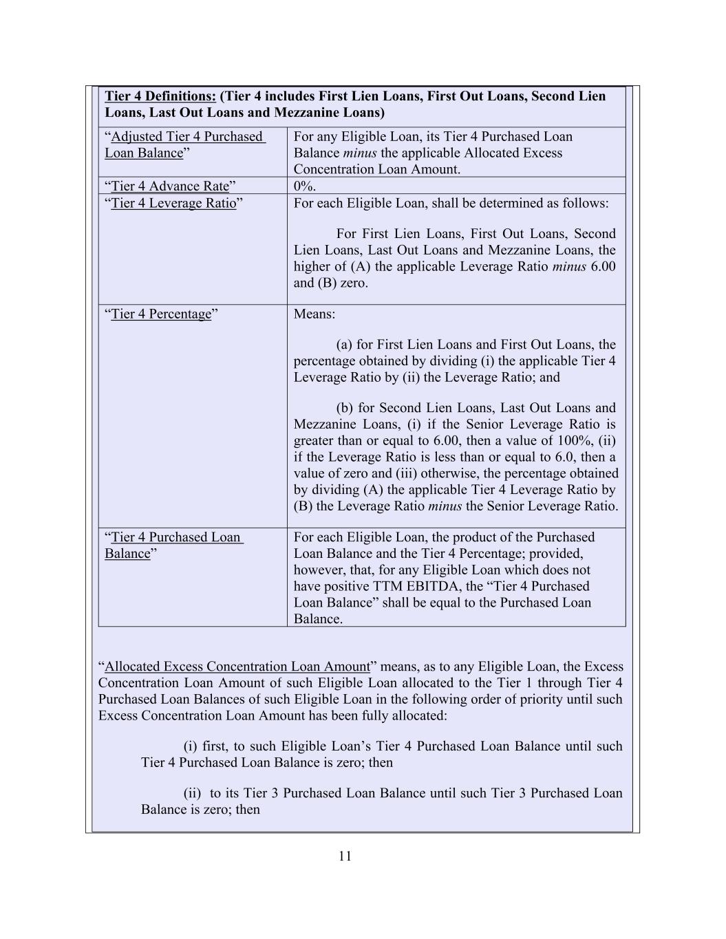11“分配的超额集中贷款金额”是指,就任何符合条件的贷款而言,该等符合条件的贷款的超额集中贷款金额按以下优先顺序分配给该等符合条件的贷款的第一级通过第四级购买贷款余额,直至该等超额集中贷款金额全部分配完毕:(i)首先分配给该等符合条件的贷款的第四级购买贷款余额,直至该第四级购买贷款余额为零;然后(ii)分配给其第三级购买贷款余额,直至该第三级购买贷款余额为零;然后为0%。每笔符合条件的贷款的“Tier4已购贷款余额”,是已购贷款余额和Tier4百分比的乘积;但前提是,对于任何不存在正的TTM EBITDA的符合条件的贷款,“Tier4已购贷款余额”应等于已购贷款余额。对于任何符合条件的贷款,其第4级购买贷款余额减去适用的分配的超额集中贷款金额。每笔符合条件的贷款的“Tier4杠杆率”,按以下方式确定:对于第一留置权贷款、先出贷款、第二留置权贷款、后出贷款和夹层贷款,采用(a)适用的杠杆率减6.00和(b)零中的较高者。Tier4定义:(Tier4包括第一留置权贷款、先出贷款、第二留置权贷款、后出贷款和夹层贷款)“Tier4百分率”“Tier4预付率”是指:(a)对于第一留置权贷款和先出贷款,通过将(i)适用的四级杠杆率除以(ii)杠杆率得到的百分比;(b)对于第二留置权贷款、后出贷款和夹层贷款,(i)如果优先杠杆率大于或等于6.00,则取值为100%,(ii)如果杠杆率小于或等于6.0,然后一个值为零,(iii)否则,通过将(a)适用的四级杠杆率除以(b)杠杆率减去高级杠杆率得到的百分比。“调整后的Tier4购买贷款余额”