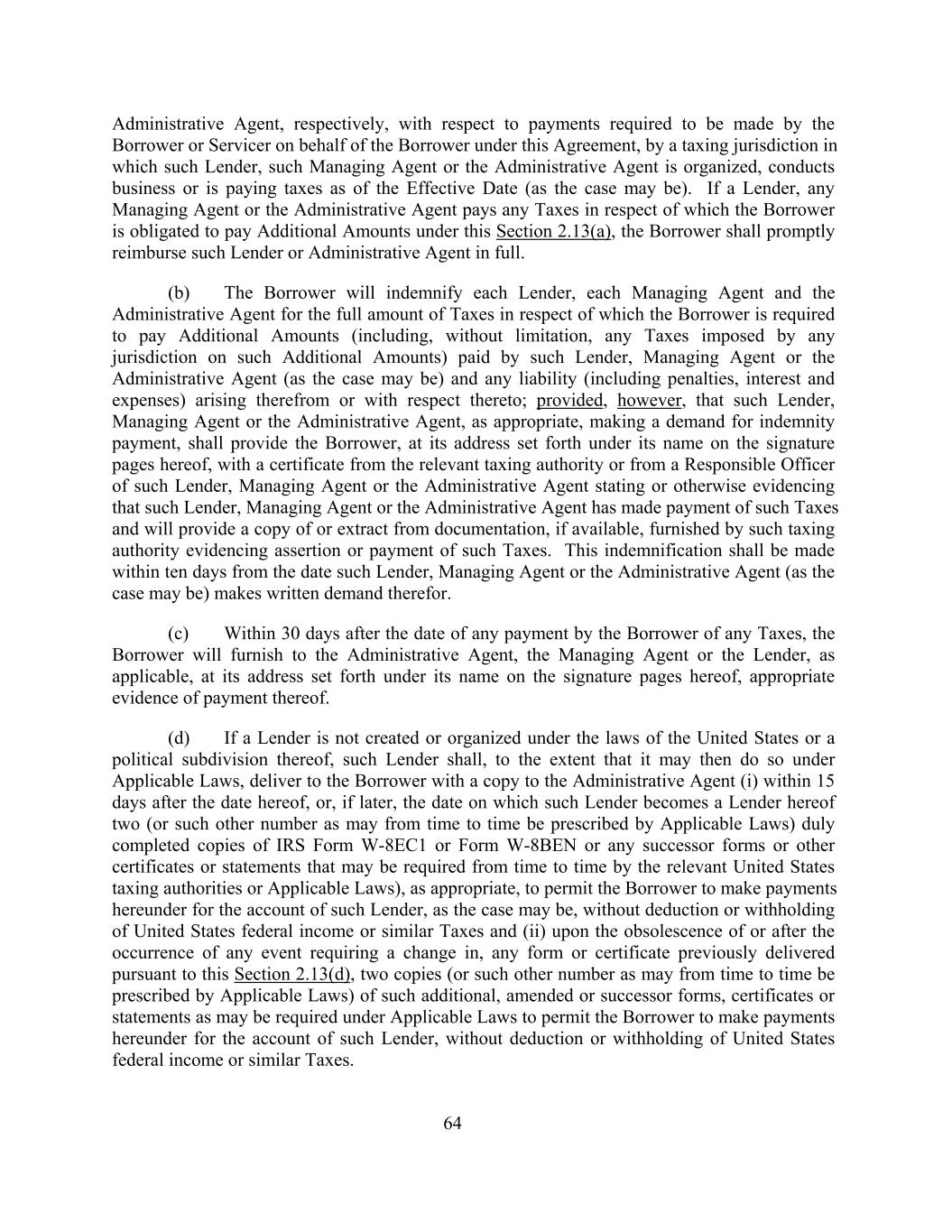 行政代理人,分别就借款人或服务人根据本协议代表借款人,由该贷款人、该管理代理人或该行政代理人组织、开展业务或截至生效日期(视情况而定)正在缴纳税款的税务管辖区要求支付的款项。如果贷款人、任何管理代理人或行政代理人支付了借款人根据本条第2.13(a)款有义务支付额外金额的任何税款,借款人应立即全额偿还该贷款人或行政代理人。(b)借款人将就借款人须就该贷款人、管理代理人或行政代理人(视属何情况而定)所支付的额外金额(包括但不限于任何司法管辖区就该等额外金额征收的任何税款)及由此产生或与此有关的任何法律责任(包括罚款、利息及开支),向每名贷款人、每名管理代理人或行政代理人(视情况而定)作出弥偿要求的全部税款,作出赔偿,但须向借款人提供,在本协议签字页上其名下所列的地址,凭相关税务机关或该贷款人、管理代理人或行政代理人的负责人员出具的证明,说明或以其他方式证明该贷款人、管理代理人或行政代理人已缴纳该等税款,并将提供该税务机关提供的证明主张或缴纳该等税款的文件副本或文件摘录(如有)。本次赔偿应当自该贷款人、经管代理人或者行政代理人(视情况而定)提出书面要求之日起十日内作出。(c)在借款人缴付任何税款的日期后30天内,借款人将向行政代理人、管理代理人或贷款人(如适用)在其在本协议签字页上其名下所列的地址提供有关付款的适当证据。(d)如果贷款人不是根据美国法律或其政治分支机构创建或组织的,则该贷款人应在其根据适用法律可能这样做的范围内,在本协议日期后15天内向借款人交付一份副本给行政代理人(i),或者,如果更晚,该贷款人成为本协议贷款人的日期(或适用法律可能不时订明的其他数目)妥为填妥的IRS表格W-8EC1或表格W-8BEN或美国相关税务当局或适用法律可能不时要求的任何继承表格或其他证明或报表的副本),以酌情允许借款人根据本协议为该贷款人的账户(视情况而定)支付款项,不扣除或扣留美国联邦收入或类似税款,以及(ii)在任何需要更改的事件发生后或发生后,根据本条2.13(d)、两份(或适用法律可能不时订明的其他号码)根据适用法律可能要求的附加、经修订或继承的表格、证书或报表的副本(或适用法律可能不时订明的其他号码),以允许借款人根据本协议为该贷款人的账户付款,不扣除或预扣美国联邦收入或类似税收。64