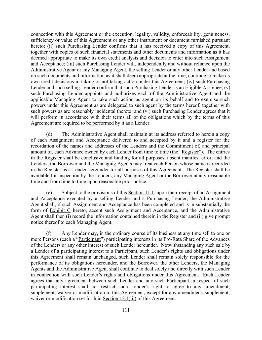 与本协议或本协议或根据本协议提供的任何其他文书或文件的执行、合法性、有效性、可执行性、真实性、充分性或价值有关;(ii)该采购贷款人确认已收到本协议的副本,连同其认为适当的财务报表和其他文件和信息的副本,以进行其自己的信用分析并决定进行此类转让和接受;(iii)该采购贷款人将独立且不依赖行政代理人或任何管理代理人,出售贷款人或任何其他贷款人并根据其当时认为适当的文件和资料,继续自行作出根据本协议采取或不采取行动的信贷决定;(iv)该购买贷款人及该出售贷款人确认该购买贷款人为合资格受让人;(v)该购买贷款人指定并授权每一行政代理人及适用的管理代理人作为其代理人采取行动,并行使本协议条款授予该代理人的本协议项下的权力,连同合理附带的权力;及(vi)该等采购贷款人同意,其将按照其条款履行本协议条款要求其作为贷款人履行的所有义务。(d)行政代理人应在其所提述的地址保存一份交付给其并由其接受的每项转让和接受的副本,以及一份登记册,用于记录贷款人的姓名和地址以及每个贷款人不时拥有的每笔垫款的承诺和本金金额(“登记册”)。登记册内的记项应是结论性的,对所有目的均具有约束力,不存在明显错误。就本协议的所有目的而言,贷款人、借款人和管理代理可将登记册内记录其姓名的每个人视为本协议项下的贷款人。登记册应在任何合理时间并在合理的事先通知后不时供贷款人、任何管理代理人或借款人查阅。(e)在符合本条第11.1条规定的情况下,行政代理人在收到由销售贷款人和采购贷款人签立的转让和接受后,如该等转让和接受已完成,且实质上为本协议的附件 C形式,则该行政代理人应接受该等转让和接受,然后该行政代理人应(i)将其中所载信息记录在登记册中,并(ii)就此迅速通知各管理代理人。(f)任何贷款人可在其正常业务过程中,随时向一名或多名人士(各自为“参与者”)出售其按比例分享的贷款人垫款权益或该贷款人在本协议项下的任何其他权益。尽管出借人将参与权益出售给参与者,但该出借人在本协议下的权利和义务保持不变,该出借人仍应全权负责履行其在本协议下的义务,借款人、其他出借人、管理代理人和行政代理人应继续就该出借人在本协议下的权利和义务单独和直接与该出借人打交道。各贷款人同意,该贷款人与任何该等参与者就该等参与权益达成的任何协议不得限制该贷款人同意对本协议进行任何修订、补充、放弃或修改的权利,但本协议第12.1(iii)节规定的任何修订、补充、放弃或修改除外。111