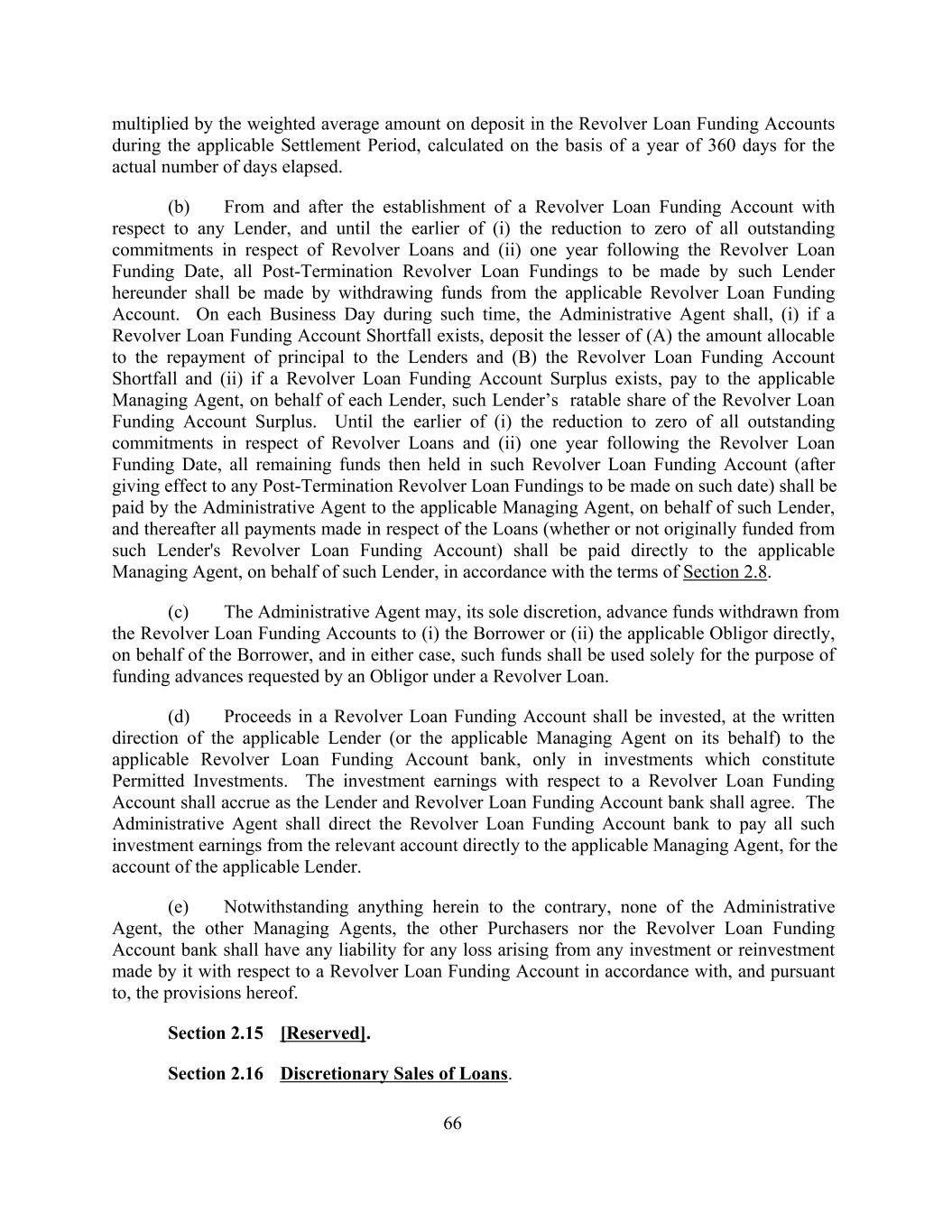 乘以适用结算期内循环贷款资金账户中存款的加权平均金额,按一年360天的实际经过天数计算。(b)自就任何贷款人设立循环贷款资金账户起及之后,直至(i)关于循环贷款的所有未偿还承付款减至零和(ii)循环贷款资金提供日期后一年(以较早者为准),该贷款人根据本协议拟作出的所有终止后循环贷款资金均应通过从适用的循环贷款资金账户中提取资金的方式作出。在这段时间内的每个营业日,行政代理人应(i)如果存在循环贷款资金账户短缺,则存入(a)可分配给贷款人偿还本金的金额和(b)循环贷款资金账户短缺中的较小者,以及(ii)如果存在循环贷款资金账户盈余,则代表每个贷款人向适用的管理代理人支付该贷款人在循环贷款资金账户盈余中的应课税份额。直至(i)将有关循环贷款的所有未偿承付款项减至零及(ii)循环贷款供资日期后一年(以较早者为准),该循环贷款供资账户中当时持有的所有剩余资金(在使将于该日期作出的任何终止后循环贷款供资生效后)应由行政代理人代表该贷款人向适用的管理代理人支付,此后,就贷款支付的所有款项(无论最初是否由该贷款人的循环贷款资金账户提供资金)应根据第2.8节的条款代表该贷款人直接支付给适用的管理代理。(c)行政代理人可全权酌情将从循环贷款资金账户中提取的资金直接代表借款人垫付给(i)借款人或(ii)适用的债务人,在任何一种情况下,此种资金应仅用于债务人根据循环贷款要求的垫款。(d)循环贷款筹资账户的收益应根据适用的贷款人(或代表其的适用管理代理人)的书面指示,仅投资于构成许可投资的投资。循环贷款资金账户的投资收益应按贷款人和循环贷款资金账户银行的约定累计。行政代理人应指示Revolver贷款资金账户银行将相关账户的所有此类投资收益直接支付给适用的管理代理人,为适用的贷款人的账户。(e)尽管本协议另有相反规定,行政代理人、其他管理代理人、其他买方或循环贷款资金账户银行均不对其根据本协议的规定并依据本协议的规定就循环贷款资金账户进行的任何投资或再投资所产生的任何损失承担任何赔偿责任。第2.15节[保留]。第2.16节酌情出售贷款。66