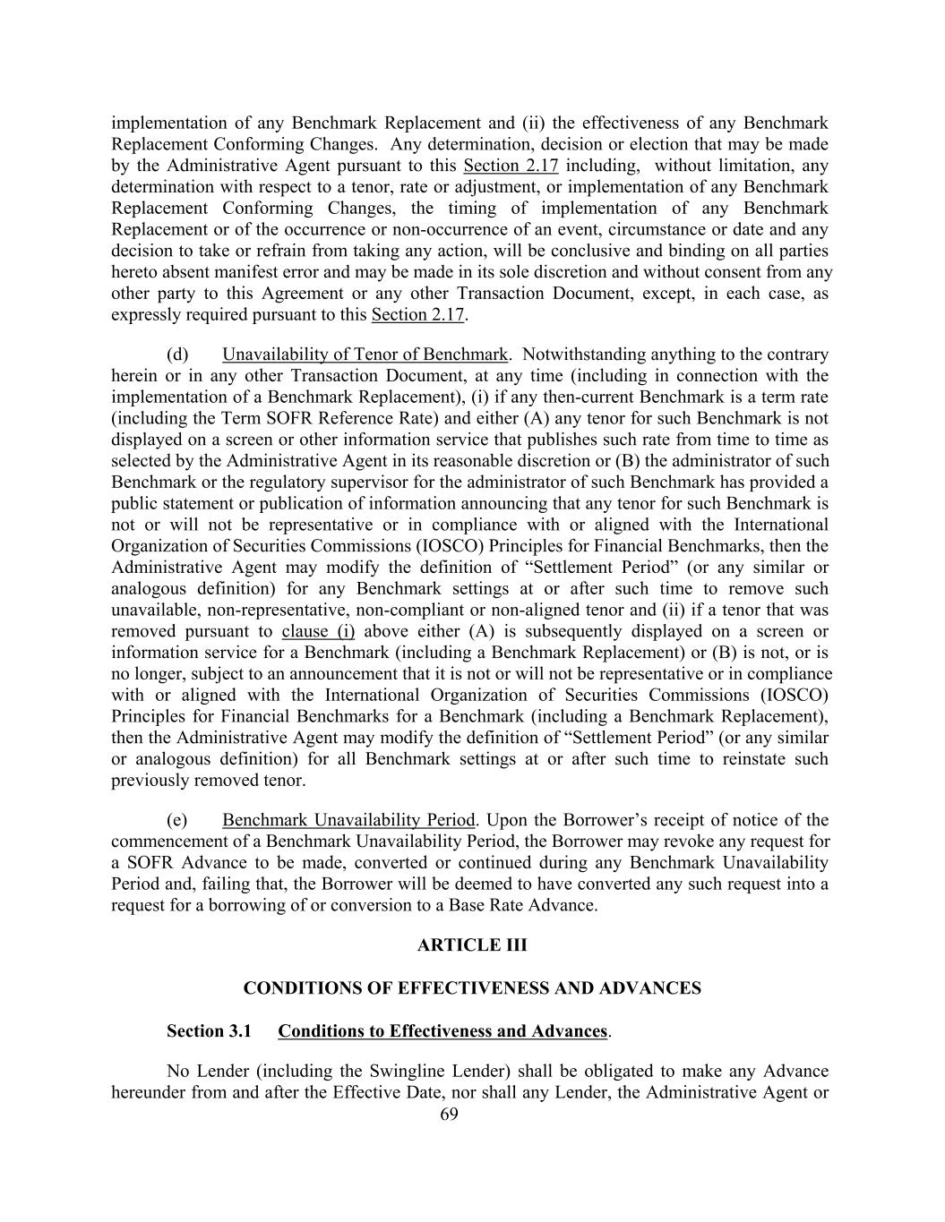 实施任何基准替换和(ii)任何基准替换符合更改的有效性。行政代理人根据本条第2.17款可能作出的任何决定、决定或选择,包括但不限于与期限、费率或调整有关的任何确定,或与任何基准更换符合变更的实施有关的任何确定,任何基准更换的实施时间或某一事件、情况或日期的发生或不发生的任何决定,以及采取或不采取任何行动的任何决定,在没有明显错误的情况下,将是决定性的并对协议各方具有约束力,并且可以自行决定并在未经本协议或任何其他交易文件的任何其他方同意的情况下作出,但在每种情况下,根据本第2.17条明确要求的除外。(d)无法获得基准期限。尽管本文或任何其他交易文件中有任何相反的规定,但在任何时候(包括与实施基准更换有关的),(一)如任何当时的基准为定期利率(包括定期SOFR参考利率),而(a)该基准的任何期限未显示在不时公布行政代理人合理酌情所选定的该利率的屏幕或其他信息服务上,或(b)该基准的管理人或该基准的管理人的监管主管已提供公开声明或公布信息,宣布此类基准的任何期限不具有或将不具有代表性,或不符合或与国际证监会组织(IOSCO)的金融基准原则保持一致,则行政代理人可在该时间或之后修改任何基准设置的“结算期”定义(或任何类似或类似定义),以删除此类不可用、不具代表性、不合规或不统一的期限和(ii)如果根据上述(a)项中的第(i)款被删除的期限随后显示在基准的屏幕或信息服务上(包括基准更换)或(b)不是或不再受以下公告的约束:该期限不具有或将不具有代表性,或不符合或符合国际证券委员会组织(IOSCO)关于基准的财务基准原则(包括基准更换),然后,行政代理人可以在该时间或之后修改所有基准设置的“结算期”定义(或任何类似或类似的定义),以恢复该先前取消的期限。(e)基准不可用期限。借款人收到基准不可用期间开始的通知后,借款人可撤销在任何基准不可用期间提出、转换或继续进行SOFR垫款的任何请求,否则,借款人将被视为已将任何此类请求转换为借入或转换为基准利率垫款的请求。第三条生效条件和推进第3.1节生效条件和推进。任何出借人(包括Swingline出借人)自生效之日起及之后均无义务在本协议项下垫付任何款项,亦无任何出借人、行政代理人或69