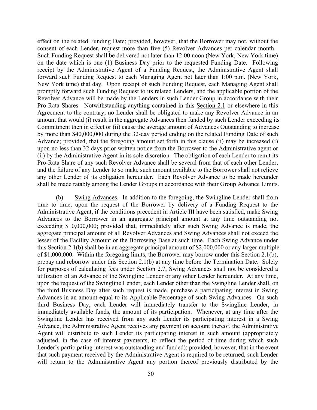 对相关筹资日期的影响;但条件是,未经每个贷款人同意,借款人不得要求每个日历月超过五(5)次循环预付款。此种资金请求应不迟于所请求的资金日期前一(1)个工作日当天中午12:00(纽约、纽约时间)送达。行政代理人收到资金请求后,行政代理人应不迟于当天下午1:00(纽约、纽约时间)将该资金请求转发给各管理代理人。在收到此种资金请求后,各管理代理应立即将此种资金请求转发给其相关的贷款人,循环预付款的适用部分将由该贷款人集团中的贷款人按照其按比例分配的份额进行。尽管本条第2.1款或本协议其他条款中有任何相反的规定,任何贷款人均无义务提供任何循环预付款,其数额将(i)导致该贷款人当时提供资金的预付款总额超过其当时有效的承诺,或(ii)导致在截至该预付款的相关供资日的32天期间内未付预付款的平均数额增加超过40,000,000美元;但,本条款第(ii)款所列的前述金额可在借款人至少提前32天向行政代理人发出书面通知或(ii)由行政代理人全权酌情决定后增加(i)。每个贷款人汇出其在任何此类循环预付款中的按比例份额的义务应与其他贷款人的义务不同,任何贷款人未能如此向借款人提供该金额不应解除任何其他贷款人根据本协议承担的义务。根据本协议将进行的每笔左轮手枪预付款应在贷款人集团之间按照其集团预付款限额按比例进行。(b)摇摆不定的进展。除上述规定外,如果第III条的先决条件已经满足,Swingline贷款人应借款人通过向行政代理人交付资金请求的方式不时向借款人提供周转垫款,其未偿还本金总额在任何时候不超过10,000,000美元;但在立即进行此种周转垫款后,所有循环垫款和周转垫款的本金总额不得超过当时的融资金额或借款基数中的较低者。根据本条第2.1(b)款,每笔周转预付款的本金总额应为2000000美元或1000000美元的任何较大倍数。在上述限额内,借款人可在终止日期前的任何时间根据本条第2.1(b)款借款、预付款项和根据本条第2.1(b)款再借款。仅为根据第2.7节计算费用的目的,周转预付款不应被视为利用Swingline贷款人或本协议项下任何其他贷款人的预付款。在任何时候,根据Swingline贷款人的请求,除Swingline贷款人之外的每一贷款人应在提出该请求后的第三个工作日购买Swingline Advances的参与权益,金额等于其在该等Swingline Advances中的适用百分比。在这样的第三个营业日,每个贷方将立即转移到Swingline贷方,在立即可用的资金中,其参与的金额。每当Swingline贷款人从任何该等贷款人收到其在一笔周转预付款中的参与权益后的任何时间,行政代理人因此收到任何付款,该行政代理人将向该贷款人分配其在该金额中的参与权益(在利息支付的情况下,适当调整以反映该贷款人的参与权益未偿还和获得资金的期间);但是,如果要求退还该行政代理人收到的此类付款,此类贷款人将向行政代理人退还此前由50