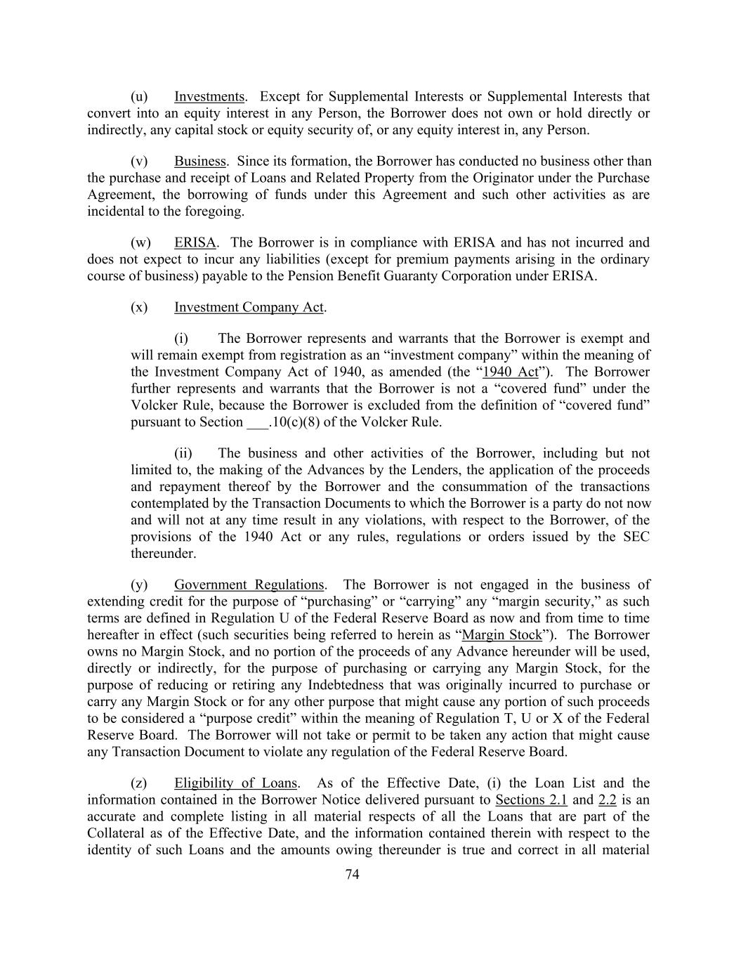 (u)投资。除补充权益或转换为任何人的股权的补充权益外,借款人不拥有或直接或间接持有任何人的任何股本或股权证券,或任何人的任何股权。(五)业务。自成立以来,借款人除根据购买协议向发起人购买和收取贷款及相关财产、根据本协议借入资金以及前述附带的其他活动外,未开展其他业务。(w)ERISA。借款人遵守ERISA,没有发生也不会预期发生根据ERISA应付给养老金福利担保公司的任何负债(正常业务过程中产生的保费付款除外)。(x)《投资公司法》。(i)借款人声明并保证,借款人获得豁免,并将继续免于登记为经修订的1940年《投资公司法》(“1940年法”)所指的“投资公司”。借款人进一步声明并保证,借款人不是沃尔克规则下的“担保基金”,因为根据沃尔克规则第____.10(c)(8)节,借款人被排除在“担保基金”的定义之外。(二)借款人的业务和其他活动,包括但不限于贷款人垫款、借款人运用收益和偿还收益以及完成借款人作为当事方的交易文件所设想的交易,现在不会也不会在任何时候导致借款人违反1940年法案的规定或SEC根据该法案发布的任何规则、条例或命令。(y)政府条例。借款人不从事以“购买”或“携带”任何“保证金证券”为目的提供信贷的业务,因为这些术语在美国联邦储备委员会条例U中定义为现在和以后不时生效(此类证券在本文中称为“保证金股票”)。借款人不拥有保证金股票,本协议项下任何预付款的收益的任何部分都不会直接或间接用于购买或持有任何保证金股票的目的,以减少或偿还最初因购买或持有任何保证金股票而产生的任何债务,或用于可能导致此类收益的任何部分被视为联邦储备委员会T、U或X条例含义内的“目的信贷”的任何其他目的。借款人不会采取或允许被采取任何可能导致任何交易文件违反联邦储备委员会任何规定的行动。(z)贷款资格。截至生效日期,(i)根据第2.1节和第2.2节交付的贷款清单和借款人通知所载信息是截至生效日期属于抵押品一部分的所有贷款在所有重大方面的准确和完整的清单,其中所载关于此类贷款的身份及其项下所欠金额的信息在所有材料中是真实和正确的74
