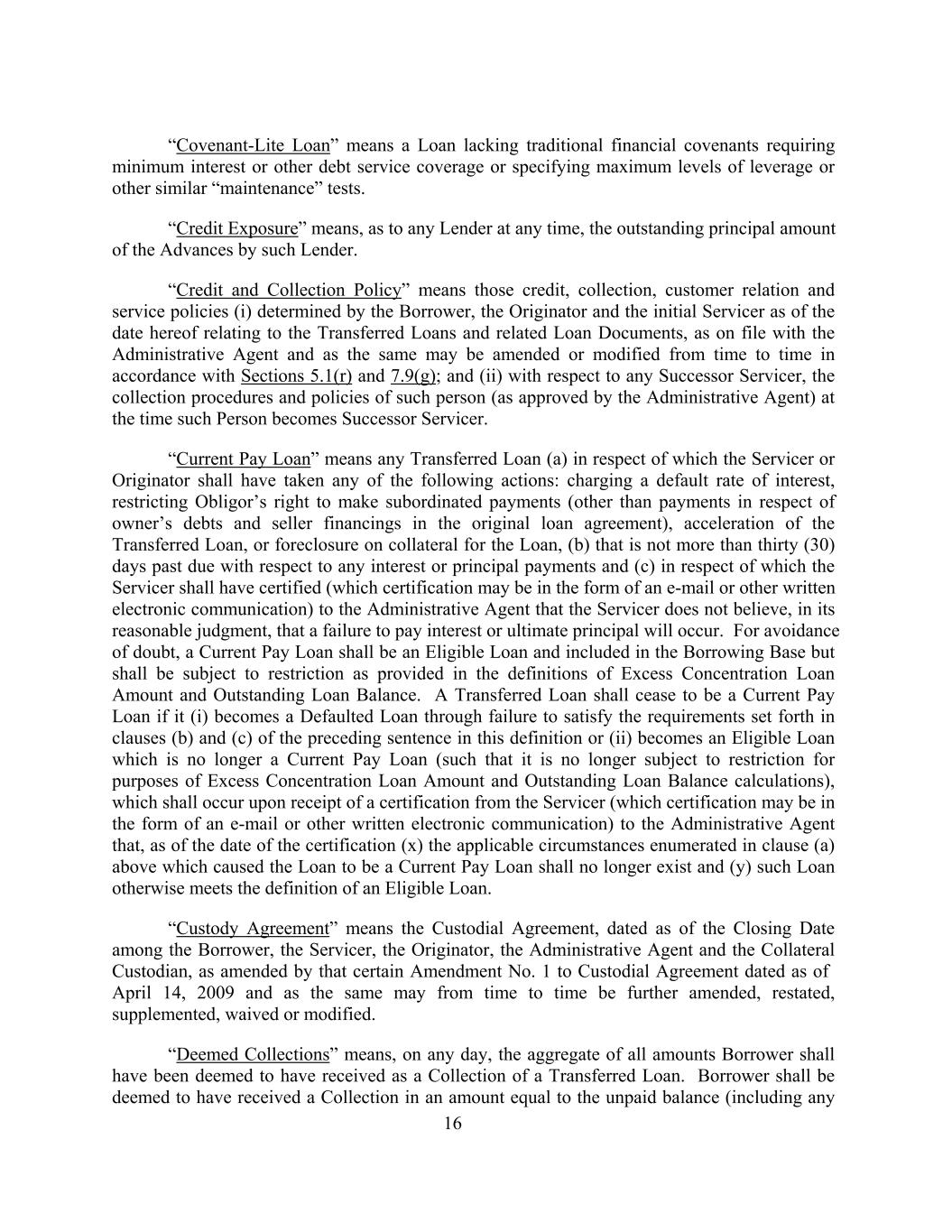 “Covenant-Lite Loan”是指缺乏传统金融契约要求最低利息或其他偿债覆盖范围或指定最高杠杆水平或其他类似“维持”测试的贷款。“信贷敞口”是指,就任何贷款人而言,在任何时候,该贷款人的垫款未偿还本金金额。“信贷和催收政策”是指借款人、发起人和初始服务商于本协议日期确定的与转让贷款和相关贷款文件有关的信贷、催收、客户关系和服务政策(i),如在行政代理人处存档,并可能根据第5.1(r)和7.9(g)条不时修订或修改;以及(ii)就任何继任服务商而言,该人(经行政代理人批准)在该人成为继任服务商时的催收程序和政策。“流动支付贷款”是指任何转让的贷款(a),服务人或发起人应已就其采取以下任何行动:收取违约利率、限制债务人进行次级付款的权利(原始贷款协议中关于所有者债务和卖方融资的付款除外)、加速转让的贷款或取消对贷款抵押品的赎回权,(b)就任何利息或本金付款逾期不超过三十(30)天,以及(c)就该等利息或本金付款,服务人须已向行政代理人证明(该证明可采用电子邮件或其他书面电子通讯的形式)服务人在其合理判断中认为不会发生未能支付利息或最终本金的情况。为免生疑问,流动支付贷款应为符合条件的贷款,并纳入借款基数,但应受到超额集中贷款金额和未偿还贷款余额定义中规定的限制。转让的贷款,如果(i)因未能满足本定义中前一句(b)和(c)条规定的要求而成为违约贷款,或(ii)成为不再是当期支付贷款的合格贷款(从而不再因超额集中贷款金额和未偿还贷款余额计算而受到限制),即不再是当期支付贷款,这种情况应在收到服务人向行政代理人发出的证明(该证明可以是电子邮件或其他书面电子通信的形式)时发生,即自证明之日起(x)上述(a)条中列举的导致贷款为当期支付贷款的适用情况将不复存在,并且(y)该贷款在其他方面符合合格贷款的定义。「托管协议」指由借款人、服务人、发起人、行政代理人及抵押保管人于截止日签署的托管协议,该协议经日期为二零零九年四月十四日的托管协议的第1号若干修订修订修订,并可能不时进一步修订、重述、补充、放弃或修改。“视为收款”是指,在任何一天,借款人应被视为已收到的所有金额的总和为已转让贷款的收款。借款人应被视为收到了金额等于未付余额的催收(包括任何16