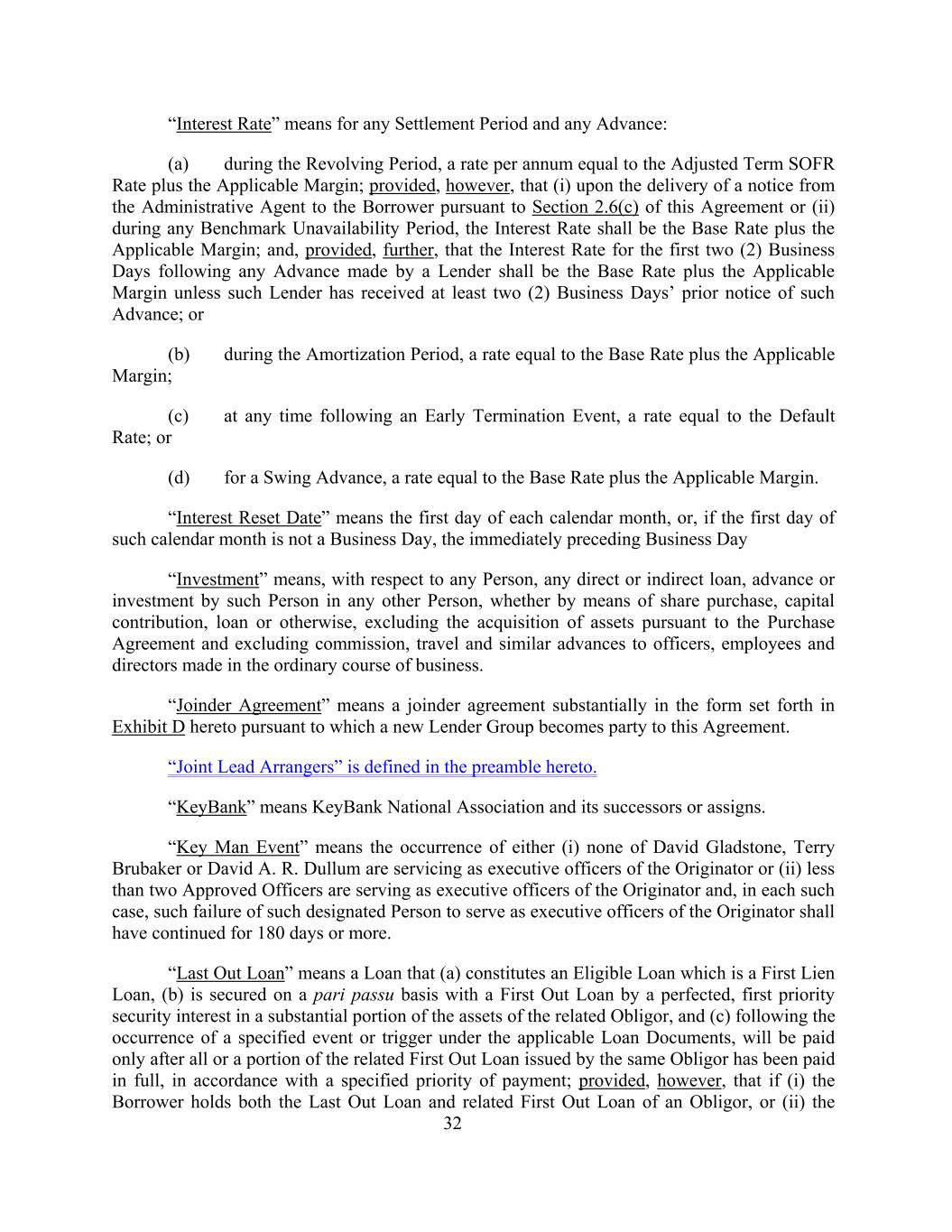 “利率”是指任何结算期和任何预付款:(a)在循环期内,年利率等于调整后的定期SOFR利率加上适用的保证金;但前提是(i)在行政代理人根据本协议第2.6(c)节向借款人发出通知时或(ii)在任何基准不可用期间,利率应为基准利率加上适用的保证金;此外,前提是,贷款人作出任何垫款后的前两(2)个营业日的利率应为基准利率加上适用的保证金,除非该贷款人已收到至少两(2)个营业日的提前通知;或(b)在摊销期内,利率等于基准利率加上适用的保证金;(c)在提前终止事件后的任何时间,利率等于违约率;或(d)对于周转垫款,利率等于基准利率加上适用的保证金。“利息重置日期”指每个日历月的第一天,或者,如果该日历月的第一天不是营业日,则紧接的前一个营业日“投资”就任何人而言,指该人以股份购买、出资、贷款或其他方式向任何其他人提供的任何直接或间接贷款、垫款或投资,不包括根据购买协议收购资产,也不包括在日常业务过程中向高级职员、雇员和董事提供的佣金、差旅和类似垫款。“合并协议”是指基本上采用本协议附件 D所述形式的合并协议,据此,一个新的贷款人集团将成为本协议的一方。“联合牵头安排人”的定义见本协议序言部分。“KeyBank”是指KeyBank全国协会及其继任者或指派人。“关键人物事件”是指发生以下任一情况:(i)David Gladstone、Terry L. Brubaker或David A. R. Dullum均未担任发起人的执行官,或(ii)担任发起人的执行官的获批准人员少于两名,并且在每种情况下,该指定人员未能担任发起人的执行官的情况应持续180天或更长时间。“Last Out Loan”是指(a)构成符合条件的贷款且为第一留置权贷款,(b)在同等基础上以相关债务人大部分资产上的完善的第一优先担保权益与优先贷款作抵押,以及(c)在发生适用贷款文件项下的特定事件或触发后,只有在同一债务人发放的相关优先贷款全部或部分已全额支付后,才能支付的贷款,按照指定的优先受偿顺序;但条件是,如果(i)借款人同时持有最后一笔贷款和债务人的相关先出贷款,或(ii)32
