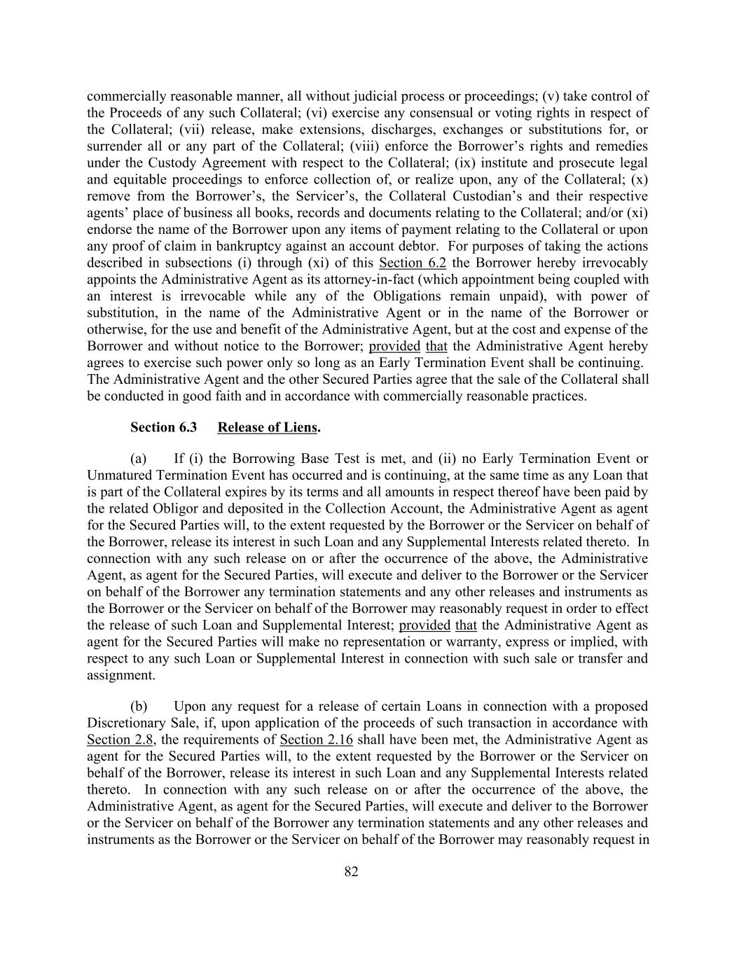 商业上合理的方式,均无需司法程序或程序;(v)控制任何该等抵押品的收益;(vi)就抵押品行使任何合意或表决权;(vii)解除、延期、解除、交换或替代或交出抵押品的全部或任何部分;(viii)强制执行借款人根据托管协议就抵押品享有的权利和补救措施;(ix)提起和起诉法律和衡平法程序,以强制收取或变现任何抵押品;(x)从借款人、服务人的,抵押品托管人及其各自代理人的营业地与抵押品有关的所有账簿、记录和文件;和/或(xi)在与抵押品有关的任何付款项目或在破产中针对账户债务人的任何债权证明上为借款人的名称背书。为采取本条第6.2款(i)至(xi)款所述的行动,借款人在此不可撤销地指定行政代理人为其事实上的代理人(在任何义务仍未得到偿付的情况下,该任命与利益相结合是不可撤销的),并具有替代权,以行政代理人的名义或以借款人的名义或其他方式,为行政代理人的使用和利益,但需由借款人承担成本和费用,且不通知借款人;但行政代理人特此同意仅在提前终止事件仍在继续的情况下行使该权力。行政代理人与其他有担保当事人约定,抵押物的出售应当本着善意,按照商业上合理的做法进行。第6.3节解除留置权。(a)如果(i)借款基础测试得到满足,并且(ii)没有发生提前终止事件或未到期的终止事件并且仍在继续,在作为抵押品一部分的任何贷款按其条款到期且与此有关的所有金额已由相关债务人支付并存入收款账户的同时,作为担保当事人代理人的行政代理人将在借款人或代表借款人的服务人要求的范围内解除其在该贷款中的利息以及与此有关的任何补充利息。就上述情况发生时或之后的任何此类解除而言,行政代理人作为有担保当事人的代理人,将代表借款人执行并向借款人或服务人交付借款人或代表借款人的服务人可能合理要求的任何终止声明和任何其他解除和文书,以实现此类贷款和补充利息的解除;但作为有担保当事人代理人的行政代理人不会作出任何明示或默示的陈述或保证,就与该等出售或转让及转让有关的任何该等贷款或补充权益而言。(b)在提出与拟议的酌情出售有关的某些贷款解除的任何请求时,如果按照第2.8节的规定申请此类交易的收益,应已满足第2.16节的要求,作为担保当事人代理人的行政代理人将在借款人或代表借款人的服务人要求的范围内,解除其在此类贷款中的权益以及与此相关的任何补充权益。就上述情况发生时或之后的任何此类解除而言,行政代理人作为有担保当事人的代理人,将代表借款人执行并向借款人或服务人交付借款人或代表借款人的服务人在82中合理要求的任何终止声明以及任何其他解除和文书
