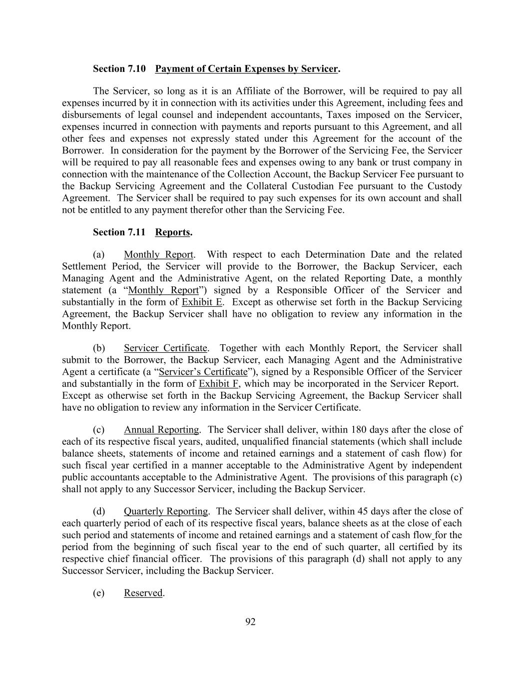 第7.10节服务商支付某些费用。服务商,只要是借款人的附属公司,将被要求支付其根据本协议开展的活动所产生的所有费用,包括法律顾问和独立会计师的费用和支出、对服务商征收的税款、与根据本协议支付的款项和报告有关的费用,以及根据本协议未明确规定的借款人账户的所有其他费用和开支。作为借款人支付服务费的代价,服务人将须支付欠任何银行或信托公司的所有合理费用及开支,与维持收款账户、根据备用服务协议的备用服务人费及根据托管协议的附属托管费有关。服务者应被要求为自己的账户支付此类费用,除服务费外,无权为此获得任何付款。第7.11节报告。(a)月度报告。就每个确定日期和相关结算期而言,服务商将在相关报告日期向借款人、备用服务商、每个管理代理和行政代理提供一份由服务商负责官员签署且基本上以附件 E形式存在的月度报表(“月度报告”)。除备用服务协议另有规定外,备用服务商没有义务审查月度报告中的任何信息。(b)服务人员证书。连同每份月度报告,服务商应向借款人、备用服务商、每个管理代理和行政代理提交一份证书(“服务商证书”),该证书由服务商的一名负责官员签署,且基本上以附件 F的形式出现,该证书可并入服务商报告。除备份服务协议另有规定外,备份服务商没有义务审查服务商证书中的任何信息。(c)年度报告。服务商应在其各自会计年度结束后180日内交付经行政代理人可接受的独立公共会计师以行政代理人可接受的方式认证的该会计年度经审计的无保留意见的财务报表(其中应包括资产负债表、损益表和留存收益表以及现金流量表)。本款(c)项的规定不适用于任何继承服务者,包括备份服务者。(d)季度报告。服务商应在其各自会计年度的每个季度期间结束后的45天内交付截至每个该期间结束时的资产负债表以及该会计年度开始至该季度末期间的损益表和留存收益表以及现金流量表,所有这些均由其各自的首席财务官证明。本款(d)项的规定不适用于任何继任服务商,包括备用服务商。(e)保留。92