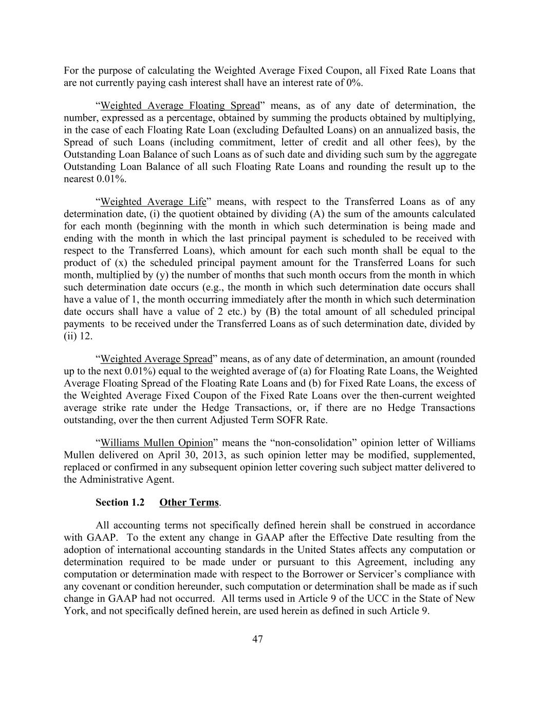 为计算加权平均固定息票,目前不支付现金利息的所有固定利率贷款的利率为0%。“加权平均浮动利差”是指,截至任何确定日期,以百分比表示的数字,在每笔浮动利率贷款(不包括违约贷款)按年化计算的情况下,通过乘以所得乘积得到的该等贷款的利差(包括承诺、信用证和所有其他费用),除以截至该日期该等贷款的未偿还贷款余额,并将该金额除以所有该等浮动利率贷款的未偿还贷款余额总额,并将结果四舍五入至最接近的0.01%。“加权平均年限”是指,就截至任何确定日期的转让贷款而言,(i)通过将(a)每个月计算的金额之和(从作出该确定的月份开始,到就转让贷款预定收到最后一笔本金的月份结束)除以而获得的商,每个该等月份的金额应等于(x)该月份转让贷款的预定本金支付金额的乘积,乘以(y)该月份自该确定日期发生的月份起发生的月份数(例如,该确定日期发生的月份的值应为1,紧接该确定日期发生的月份之后发生的月份的值应为2等)乘以(b)截至该确定日期根据转让贷款将收到的所有预定本金付款总额除以(ii)12。“加权平均利差”是指,截至任何确定日期,金额(四舍五入到下一个0.01%)等于(a)浮动利率贷款、浮动利率贷款的加权平均浮动利差和(b)固定利率贷款的加权平均数,固定利率贷款的加权平均固定息票超过对冲交易项下当时的加权平均执行利率的部分,或者,如果没有未完成的对冲交易,超过当时调整的期限SOFR利率。“威廉姆斯 Mullen意见”是指2013年4月30日交付的威廉姆斯 Mullen的“非合并”意见函,因此该意见函可能会在随后交付给行政代理人的任何涵盖该标的的意见函中进行修改、补充、替换或确认。第1.2节其他条款。此处未具体定义的所有会计术语应按照GAAP进行解释。如果由于在美国采用国际会计准则而在生效日期之后导致的GAAP的任何变化影响到根据本协议或根据本协议要求进行的任何计算或确定,包括就借款人或服务商遵守本协议下的任何契约或条件所进行的任何计算或确定,则应按照未发生GAAP的此类变化的方式进行此类计算或确定。纽约州的UCC第9条中使用的所有术语,且在此未作具体定义的,均按此类第9条中的定义在此使用。47