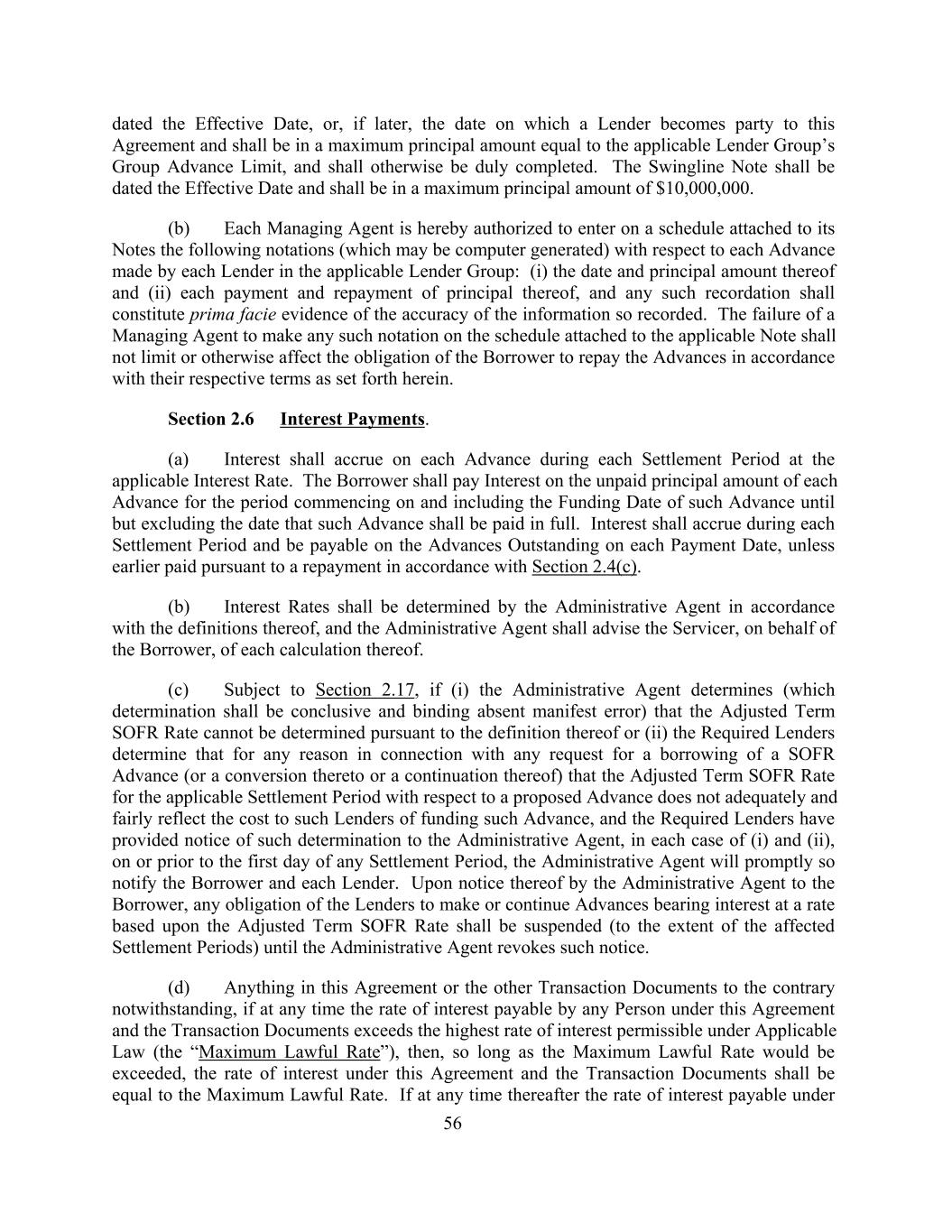 日期为生效日期,或者,如果更晚,则为贷款人成为本协议一方的日期,其最高本金金额应等于适用的贷款人集团的集团预付款限额,否则应适当完成。Swingline票据的日期应为生效日期,最高本金金额为10,000,000美元。(b)特此授权每名管理代理人在其票据所附的附表上,就适用的贷款集团中每名贷款人作出的每笔垫款记入以下记号(可能是计算机生成的):(i)其日期和本金金额以及(ii)其每笔本金的支付和偿还,任何此类记录应构成如此记录的信息准确性的表面证据。管理代理人未能在适用票据所附的附表上作出任何此类注明,不应限制或以其他方式影响借款人按照本文件规定的各自条款偿还垫款的义务。第2.6节利息支付。(a)在每个结算期内,每笔预付款应按适用利率计息。借款人应就每笔垫款的未付本金支付自该垫款的供资日(包括该日)开始的期间的利息,直至但不包括该垫款应全额支付之日。利息应在每个结算期内累积,并应在每个支付日就未偿还的预付款支付,除非根据根据第2.4(c)节的还款提前支付。(b)利率应由行政代理人按照其定义确定,行政代理人应代表借款人将其每一次计算通知服务人。(c)除第2.17条另有规定外,如果(i)行政代理人确定(该确定应是决定性的且无明显错误的情况下具有约束力)无法根据其定义确定调整后的定期SOFR利率,或(ii)所需贷款人确定,出于与任何请求借入SOFR预付款(或转换为其或其延续)有关的任何原因,就拟议预付款而言的适用结算期的调整后定期SOFR利率没有充分和公平地反映此类贷款人为该预付款提供资金的成本,而规定的贷款人已向行政代理人提供有关该决定的通知,在(i)及(ii)的每宗个案中,在任何结算期的第一天或之前,行政代理人将迅速如此通知借款人及每名贷款人。经行政代理人向借款人发出通知,贷款人按调整后的定期SOFR利率支付或继续支付有息垫款的任何义务应暂停(以受影响的结算期为限),直至行政代理人撤销该通知。(d)尽管本协议或其他交易文件中有任何相反的规定,但如果在任何时候任何人根据本协议和交易文件应支付的利率超过适用法律允许的最高利率(“最高合法利率”),那么,只要超过最高合法利率,本协议和交易文件下的利率应等于最高合法利率。如果在此后的任何时间,根据56应付的利率