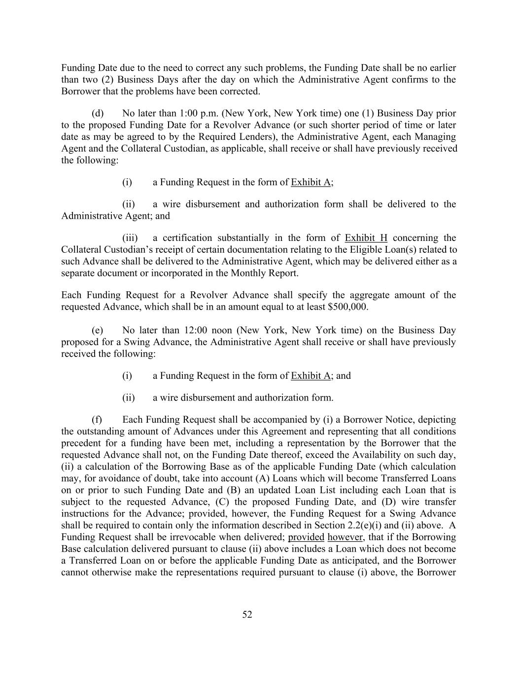 供资日因需要纠正任何此类问题,供资日不得早于行政代理人向借款人确认问题已纠正之日后的两(2)个工作日。(d)不迟于下午1:00(纽约、纽约时间)左轮手枪预付款的拟议筹资日期(或所需贷款人可能同意的较短期限或较后日期)前一(1)个工作日,行政代理人、各管理代理人和抵押品托管人(视情况而定),应收到或应已收到以下文件:(i)以附件 A形式提出的资金请求;(ii)应向行政代理人交付电汇付款和授权表格;(iii)应向行政代理人交付一份基本上以TERMH形式提供的证明,该证明涉及抵押托管人收到与此种垫款有关的合格贷款(s)有关的某些文件,该证明可作为单独的文件交付或并入月度报告。每个循环预付款的资金请求应具体说明请求预付款的总额,其数额应至少等于500,000美元。(e)不迟于提出周转预付款的工作日中午12:00(纽约、纽约时间),行政代理人应收到或应已收到以下文件:(i)以附件 A形式提出的资金请求;(ii)电汇付款和授权表格。(f)每一笔资金请求均应附有(i)一份借款人通知,说明本协定项下未偿还的预付款数额,并表示已满足提供资金的所有先决条件,包括借款人表示所要求的预付款在其提供资金之日不得超过该日的可用量,(ii)计算截至适用的提供资金之日的借款基数(为免生疑问,该计算可考虑到(a)在该融资日期或之前将成为转让贷款的贷款,以及(b)更新的贷款清单,包括受要求的预付款约束的每笔贷款,(c)拟议的融资日期,以及(d)预付款的电汇指示;但条件是,周转预付款的资金请求应要求仅包含上文第2.2(e)(i)和(ii)节中描述的信息。资金请求在交付时不可撤销;但条件是,如果根据上文第(ii)条交付的借款基数计算包括一笔贷款,而该贷款并未在预期的适用资金提供日期或之前成为已转让贷款,且借款人无法以其他方式作出根据上文第(i)条要求的陈述,则借款人52