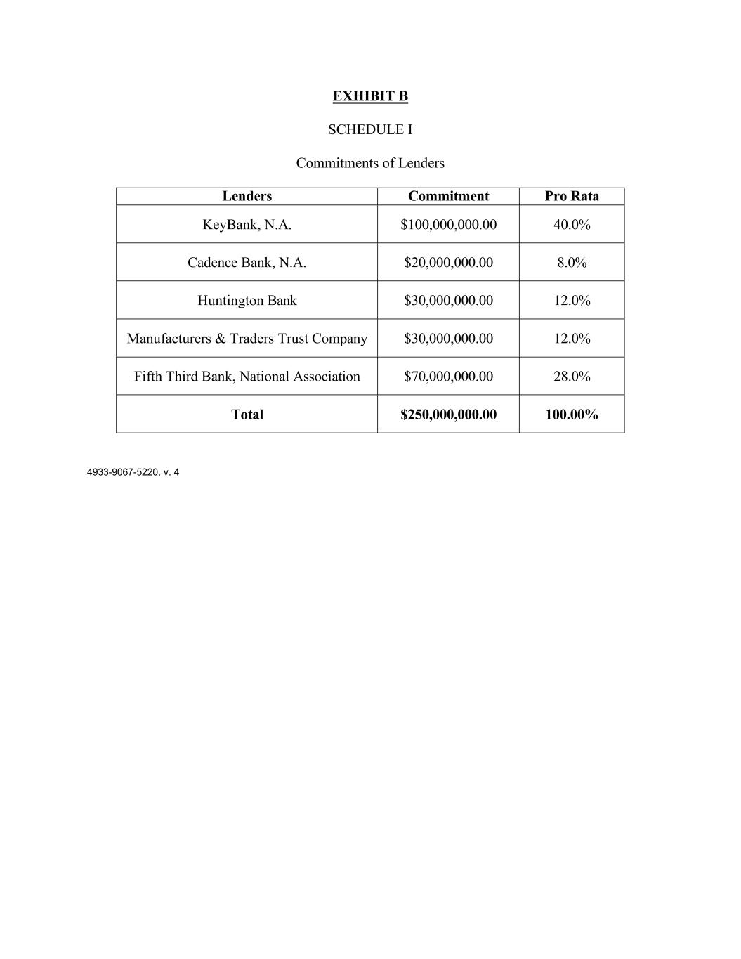 表B附表I贷款人的承诺贷款人按比例承诺KeyBank,N.A. $ 100,000,000.00 40.0% Cadence Bank,N.A. $ 20,000,000.008.0% Huntington Bank $ 30,000,000.00 12.0% Manufacturers & Traders Trust Company $ 30,000,000.00 12.0% 五三银行 Bank,National Association $ 70,000,000.00 28.0% Total $ 250,000,000.00 100.00% 4933-9067-5220,v.4