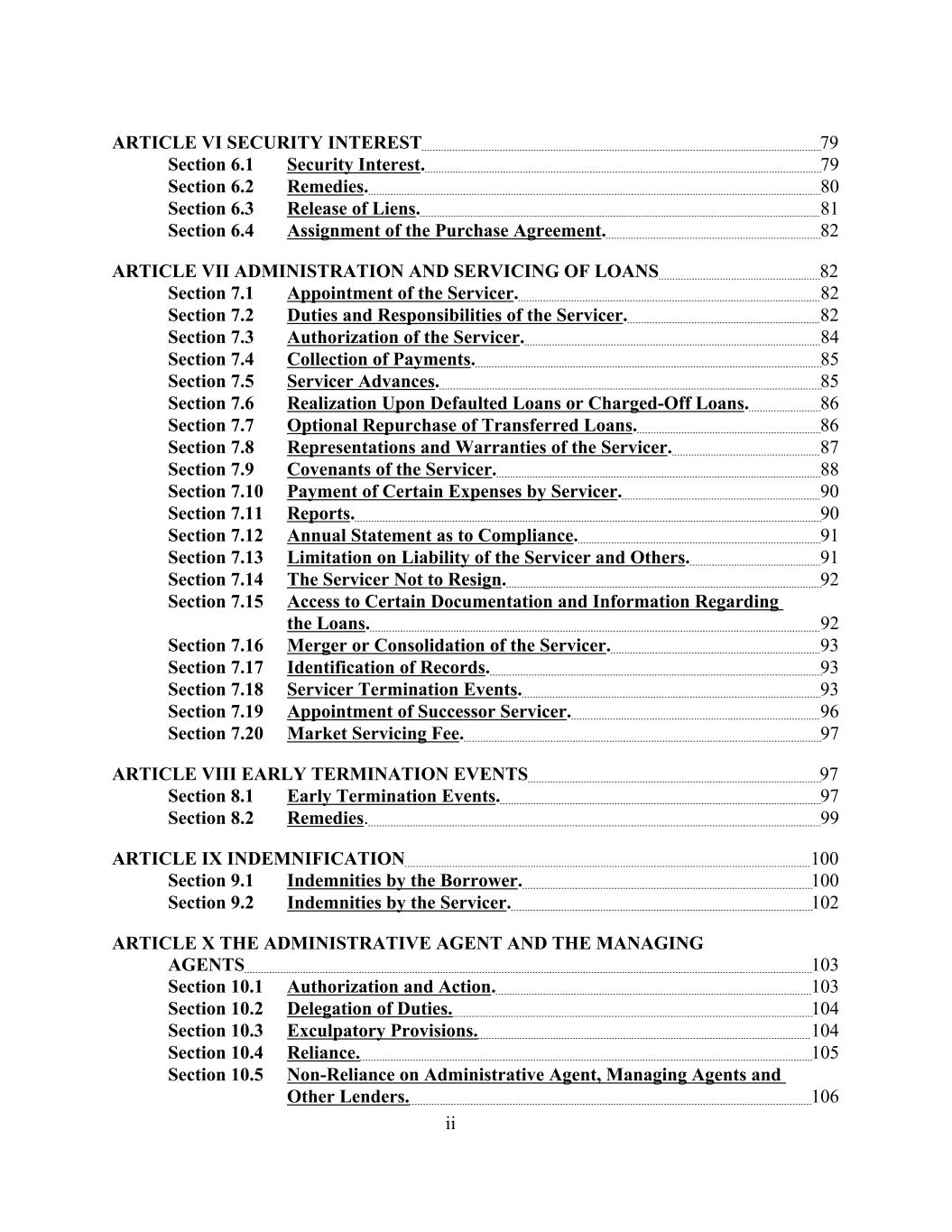 第六条担保权益第七十九条第6.1款担保权益。79第6.2节补救办法。80第6.3节留置权的解除。81采购协议第6.4节转让。82第七条贷款的管理和服务82第7.1节服务人的任命。82第7.2节服务者的义务和责任。82第7.3节服务商的授权。84第7.4节收款。85第7.5节服务商垫款。85第7.6节违约贷款或核销贷款时的变现。86第7.7节转让贷款的可选回购。86第7.8节服务商的陈述和保证。87第7.9条服务人的盟约。88第7.10节服务者支付某些费用。90第7.11节报告。90第7.12节关于合规的年度声明。91第7.13节服务人及其他人的责任限制。91第7.14节服务者不辞职。92第7.15节查阅有关贷款的某些文件和信息。92第7.16节服务商的合并或合并。93第7.17节记录的识别。93第7.18节服务器终止事件。93第7.19条委任继任服务人。96第7.20节市场服务费。97第八条提前终止事项97第8.1节提前终止事项。97第8.2节补救办法。99第九条赔偿100第9.1节借款人的赔偿。100第9.2节服务商的赔偿。102第十条行政代理和管理代理103第10.1节授权和行动。103第10.2节职责下放。104第10.3节免责条款。104第10.4节依赖。105第10.5节不依赖行政代理、经办代理和其他出借人。106二