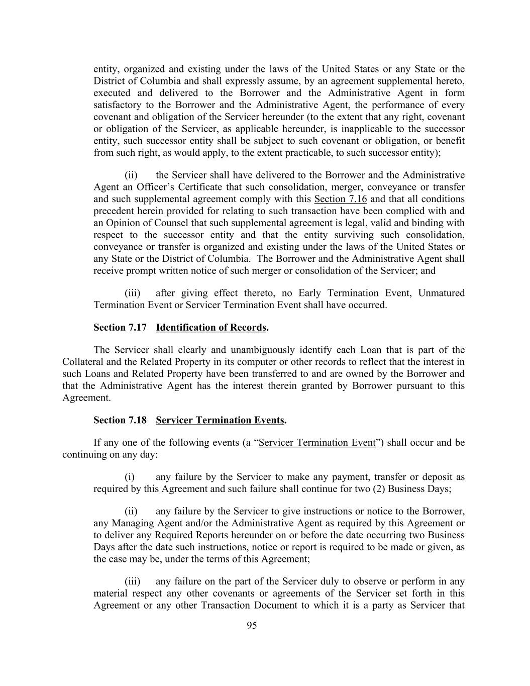 实体,根据美国或任何州或哥伦比亚特区的法律组织和存在,并应通过本协议的补充协议明确承担以借款人和行政代理人满意的形式签署并交付给借款人和行政代理人的每一项契约和义务的履行(在本协议项下适用的任何权利、契约或义务不适用于继承实体的范围内,该继承实体应受该契约或义务的约束,或受益于该权利(如适用),(二)在切实可行范围内,向该继承实体);(二)服务人应已向借款人和行政代理人交付一份官员证书,证明此类合并、合并、转易或转让以及此类补充协议符合本条第7.16款的规定,且此处规定的与此类交易有关的所有先决条件均已得到遵守,以及律师关于此类补充协议对继承实体以及在此类合并中幸存的实体具有法律效力和约束力的意见,运输或转让是根据美国或任何州或哥伦比亚特区的法律组织和存在的。借款人和行政代理人应当及时收到服务商合并或合并的书面通知;(iii)在其生效后,不得发生提前终止事件、未到期终止事件或服务商终止事件。第7.17节记录的识别。服务人应在其计算机或其他记录中明确无误地识别属于担保物和相关财产的每笔贷款,以反映此类贷款和相关财产的权益已转移给借款人并归其所有,并且行政代理人拥有借款人根据本协议授予的其中权益。第7.18节服务商终止事件。如发生以下任何一项事件(“服务商终止事件”)并在任何一天继续发生:(i)服务商未能按照本协议的要求进行任何付款、转账或存款,且该等失败应持续两(2)个工作日;(ii)服务商未能按照本协议的要求向借款人、任何管理代理人和/或行政代理人发出指示或通知,或未能在该等指示日期后两个工作日发生的日期或之前交付本协议项下所要求的任何报告,根据本协议的条款,须作出或发出通知或报告(视属何情况而定);(iii)服务人未能适当遵守或在任何重要方面履行本协议或其作为服务人的一方的任何其他交易文件所载的服务人的任何其他契诺或协议95