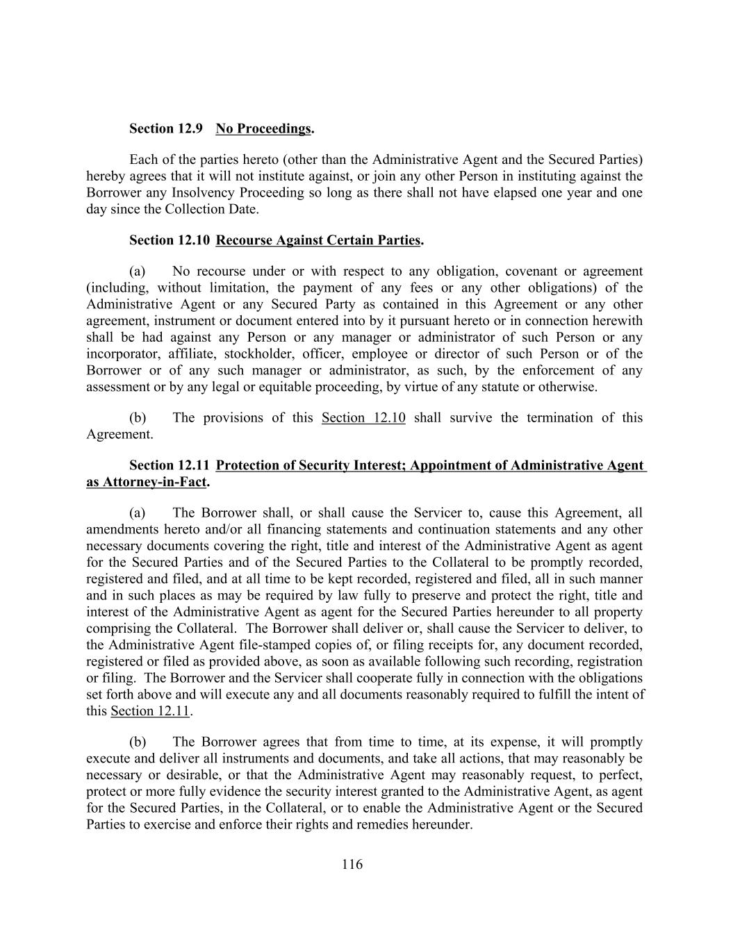 第12.9节没有诉讼程序。协议各方(行政代理人和有担保方除外)特此同意,只要自收款之日起未经过一年零一天,其将不对借款人提起或与任何其他人一起对借款人提起任何破产程序。第12.10节对某些当事人的追索。(a)不得根据本协议或其依据本协议订立或与本协议有关的任何其他协议、文书或文件所载的行政代理人或任何有担保方的任何义务、契诺或协议(包括但不限于支付任何费用或任何其他义务)对任何人或该人的任何经理或管理人或该人的任何入主人、联属公司、股东、高级职员、雇员或该人的董事或借款人或任何该等经理或管理人的任何雇员或董事(如通过强制执行任何评估或通过任何法律或衡平法程序,凭借任何法规或其他方式。(b)本条第12.10款的规定在本协议终止后仍然有效。第12.11节担保权益保护;指定行政代理人为实际代理人。(a)借款人应或应促使服务人促使迅速记录、登记和归档本协议、本协议的所有修订和/或所有融资报表和延续报表以及涵盖作为担保当事人代理人的行政代理人和担保物当事人的权利、所有权和利益的任何其他必要文件,并在任何时候保持记录、登记和归档,所有这些都以法律可能要求的方式和地点充分维护和保护该权利,本协议项下作为担保方代理人的行政代理人对构成担保物的全部财产的所有权和权益。借款人应在上述记录、登记或归档后,尽快将上述记录、登记或归档的任何文件的盖章副本或归档收据交付给行政代理人,或应促使服务人交付给该文件的盖章副本或归档收据。借款人和服务人应就上述义务充分合作,并将执行为实现本条第12.11款的意图而合理要求的任何和所有文件。(b)借款人同意,不时自费迅速签立和交付所有文书和单证,并采取合理必要或可取的一切行动,或行政代理人可合理要求、完善、保护或更充分证明授予行政代理人作为担保方代理人在担保物上的担保权益,或使行政代理人或担保方能够行使和强制执行其在本协议项下的权利和补救办法。116