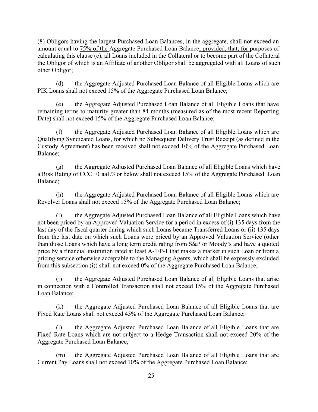 (8)拥有最大已购贷款余额的债务人,合计不得超过相当于已购贷款余额总额75%的金额;但为计算本条(c),包括在担保物中的所有贷款或成为担保物一部分的所有贷款,而该担保物的义务人是另一义务人的关联方,则应与该另一义务人的所有贷款汇总;(d)属于PIK贷款的所有合格贷款的调整后购买贷款余额总额不得超过所购买贷款余额总额的15%;(e)所有合格贷款的调整后购买贷款余额总额剩余到期期限超过84个月(以最近一个报告日计量)的,不得超过购买贷款总额余额的15%;(f)属于合格银团贷款的所有合格贷款的调整后购买贷款总额,未收到后续交付信托收据(定义见托管协议)的,不得超过已购贷款总余额的10%;(g)风险评级为CCC +/Caa1/3的所有合格贷款的调整后已购贷款总余额不得超过所购贷款余额总额的15%;(h)属于循环贷款的所有合格贷款的调整后所购贷款余额总额不得超过所购贷款余额总额的15%;(i)未经认可估值服务定价的所有合格贷款的调整后所购贷款余额总额在超过(i)此类贷款成为转让贷款的财政季度的最后一天起135天或(ii)此类贷款由认可估值服务定价的最后日期起135天的期间内(不包括那些具有标普或穆迪的长期信用评级且由在此类贷款中做市的至少评级为A-1/P-1的金融机构报价的贷款或来自管理代理以其他方式可接受的定价服务的贷款,被明确排除在本款之外的(i))不得超过总购买贷款余额的0%;(j)与受控交易有关的所有合格贷款的总调整购买贷款余额不得超过总购买贷款余额的15%;(k)属于固定利率贷款的所有合格贷款的总调整购买贷款余额不得超过总购买贷款余额的45%;(l)所有合格贷款的总调整购买贷款余额即不受套期交易约束的固定利率贷款,不得超过总购买贷款余额的20%;(m)所有符合条件的属于当期支付贷款的贷款的调整后总购买贷款余额不得超过总购买贷款余额的10%;25