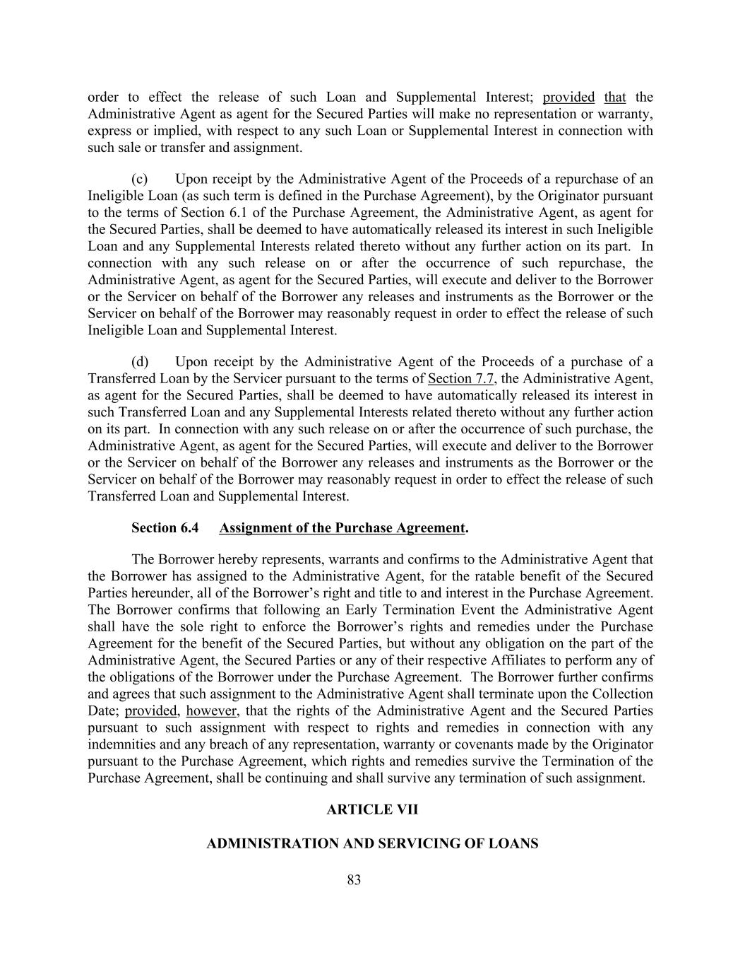 令解除此类贷款和补充利息;但作为担保当事人代理人的行政代理人不会就与此类出售或转让和转让有关的任何此类贷款或补充利息作出任何明示或默示的陈述或保证。(c)在行政代理人根据购买协议第6.1节的条款收到回购不合格贷款(如购买协议中对该术语的定义)的收益时,由发起人根据购买协议第6.1节的条款,该行政代理人作为有担保当事人的代理人,应被视为已自动解除其在该不合格贷款中的权益以及与之相关的任何补充权益,而无需其采取任何进一步行动。就任何此类解除而言,在此类回购发生时或之后,行政代理人作为有担保当事人的代理人,将代表借款人执行并向借款人或服务人交付借款人或代表借款人的服务人可能合理要求的任何解除和票据,以实现此类不合格贷款和补充利息的解除。(d)行政代理人根据第7.7节的条款收到服务人购买转让贷款的收益后,该行政代理人作为有担保当事人的代理人,应被视为自动解除其在该转让贷款中的权益以及与之相关的任何补充权益,而无需其采取任何进一步行动。就此类购买发生时或之后的任何此类解除而言,行政代理人作为有担保当事人的代理人,将代表借款人执行并向借款人或服务人交付借款人或代表借款人的服务人可能合理要求的任何解除和票据,以实现此类转让贷款和补充利息的解除。第6.4节购买协议的转让。借款人在此向行政代理人陈述、保证和确认,借款人为了本协议项下有担保方的可评定利益,已将借款人在购买协议中的所有权利、所有权和权益转让给行政代理人。借款人确认,在发生提前终止事件后,行政代理人应拥有为有担保当事人的利益强制执行借款人在购买协议项下的权利和补救措施的唯一权利,但行政代理人、有担保当事人或其各自的任何关联人没有任何义务履行借款人在购买协议项下的任何义务。借款人进一步确认并同意,向行政代理人的此类转让应于收款日期终止;但条件是,行政代理人和有担保当事人根据此类转让就与任何赔偿和任何违反发起人根据购买协议作出的任何陈述、保证或契诺有关的权利和补救办法(这些权利和补救办法在购买协议终止后仍然有效)的权利和补救办法应继续存在,并应在此类转让的任何终止后仍然有效。第七条贷款的管理和服务83