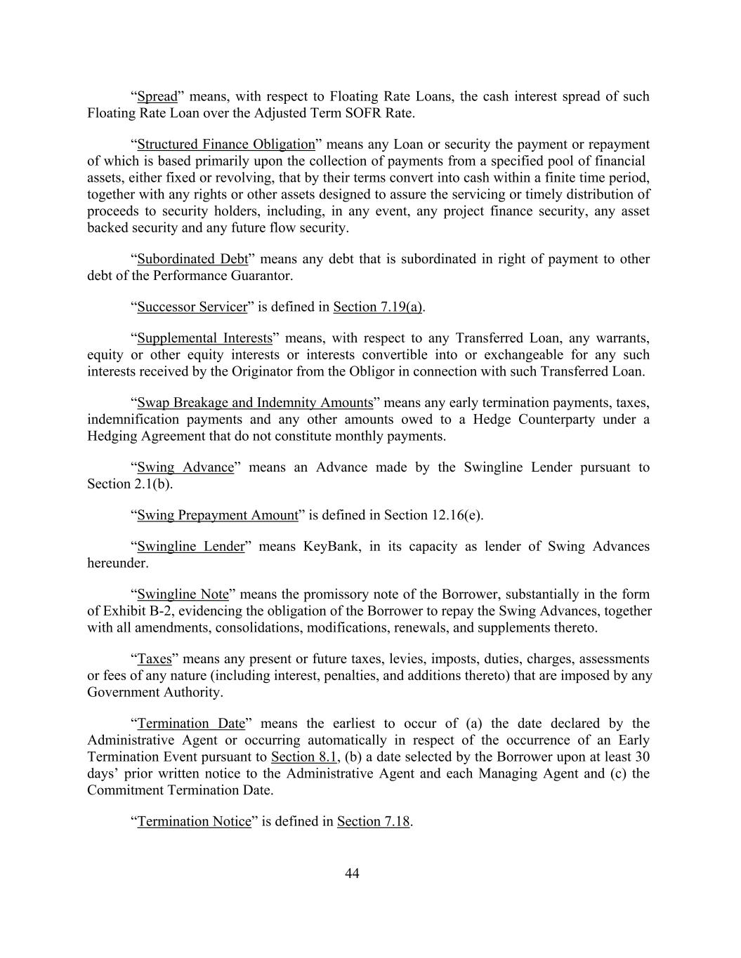 “利差”是指,就浮动利率贷款而言,这种浮动利率贷款相对于调整后的期限SOFR利率的现金利差。“结构性融资义务”是指支付或偿还的任何贷款或证券,其支付或偿还主要基于从指定的固定或循环金融资产池中收取的款项,这些款项按其条款在有限的时间段内转换为现金,以及旨在确保向证券持有人提供服务或及时分配收益的任何权利或其他资产,无论如何,包括任何项目融资证券、任何资产支持证券和任何未来流动证券。“次级债”是指与履约保证人的其他债务在受偿权上处于从属地位的任何债务。“继任服务商”在第7.19(a)节中定义。“补充权益”是指,就任何转让贷款而言,任何认股权证、股权或其他可转换为或可交换为发起人从债务人收到的与该等转让贷款有关的任何该等权益的股权或权益。“掉期违约和赔偿金额”是指任何提前终止付款、税款、赔偿付款以及根据对冲协议欠对冲交易对手的任何其他不构成每月付款的金额。“Swing Advance”是指Swingline贷款人根据第2.1(b)节进行的垫款。“周转预付款金额”在第12.16(e)节中定义。“Swingline Lender”是指KeyBank,其身份是本协议项下的Swing Advances贷款人。“Swingline票据”是指借款人的本票,基本上以附件 B-2的形式出现,证明借款人偿还Swing垫款的义务,以及对其的所有修订、合并、修改、续期和补充。“税”是指任何政府当局目前或未来征收的任何性质的税、征费、征费、关税、收费、评估或费用(包括利息、罚款及其附加)。“终止日期”是指(a)根据第8.1节就提前终止事件的发生由行政代理人声明或自动发生的日期,(b)借款人在至少提前30天向行政代理人和每个管理代理人发出书面通知后选定的日期和(c)承诺终止日期中最早发生的日期。“终止通知”在第7.18节中定义。44