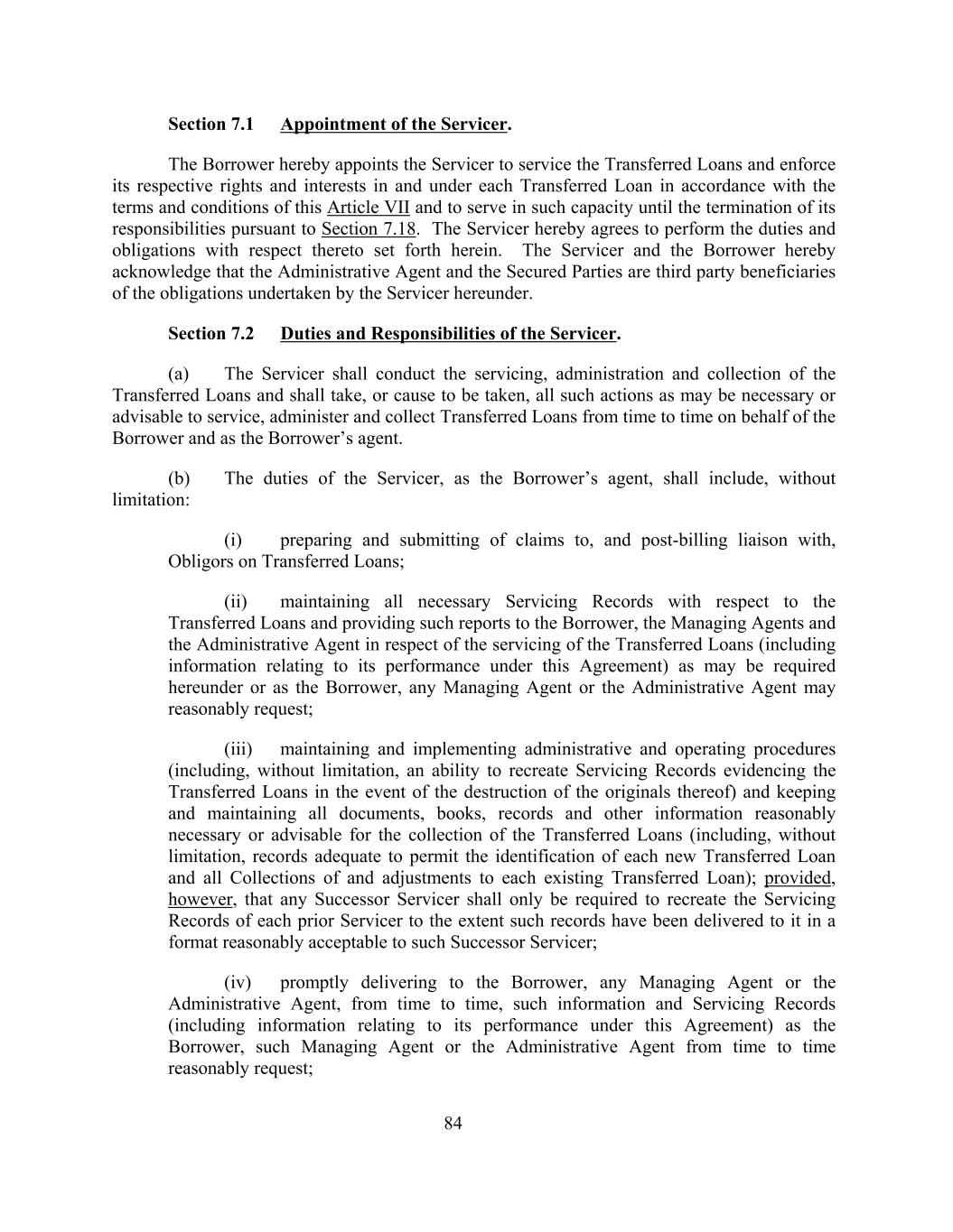 第7.1节任命随员。借款人特此指定服务人为转让贷款提供服务,并根据本条第七条的条款和条件强制执行其在每笔转让贷款中和在每笔转让贷款下各自的权利和利益,并以该身份服务,直至根据第7.18条终止其责任。服务商在此同意履行与此相关的职责和义务。服务商和借款人在此确认,行政代理人和担保方是服务商在本协议项下所承担义务的第三方受益人。第7.2节服务者的职责和责任。(a)服务人须进行所转让贷款的服务、管理及收取,并须采取或安排采取一切必要或可取的行动,以不时代表借款人及作为借款人的代理人送达、管理及收取所转让贷款。(b)服务人作为借款人的代理人,其职责应包括但不限于:(i)准备并向转让贷款的债务人提交债权,并与其进行账单后联络;(ii)保存与转让贷款有关的所有必要的服务记录,并向借款人、管理代理人和行政代理人提供根据本协议或作为借款人可能要求的与转让贷款的服务有关的报告(包括与其根据本协议履行有关的信息),任何管理代理人或行政代理人可合理要求;(iii)维持和执行行政和操作程序(包括但不限于在所转让贷款的原件被销毁时重新创建证明所转让贷款的服务记录的能力),并保持和维护为收取所转让贷款而合理必要或可取的所有文件、簿册、记录和其他信息(包括但不限于足以允许识别每笔新的已转让贷款以及每笔现有已转让贷款的所有收款和调整的记录);但是,前提是,任何继承服务人只须在该等记录已按该继承服务人合理可接受的格式交付予其的范围内,重新创建每名先前服务人的服务记录;(iv)迅速向借款人、任何管理代理人或行政代理人不时交付借款人、该管理代理人或该行政代理人不时合理要求的资料及服务记录(包括与其根据本协议履行有关的资料);84