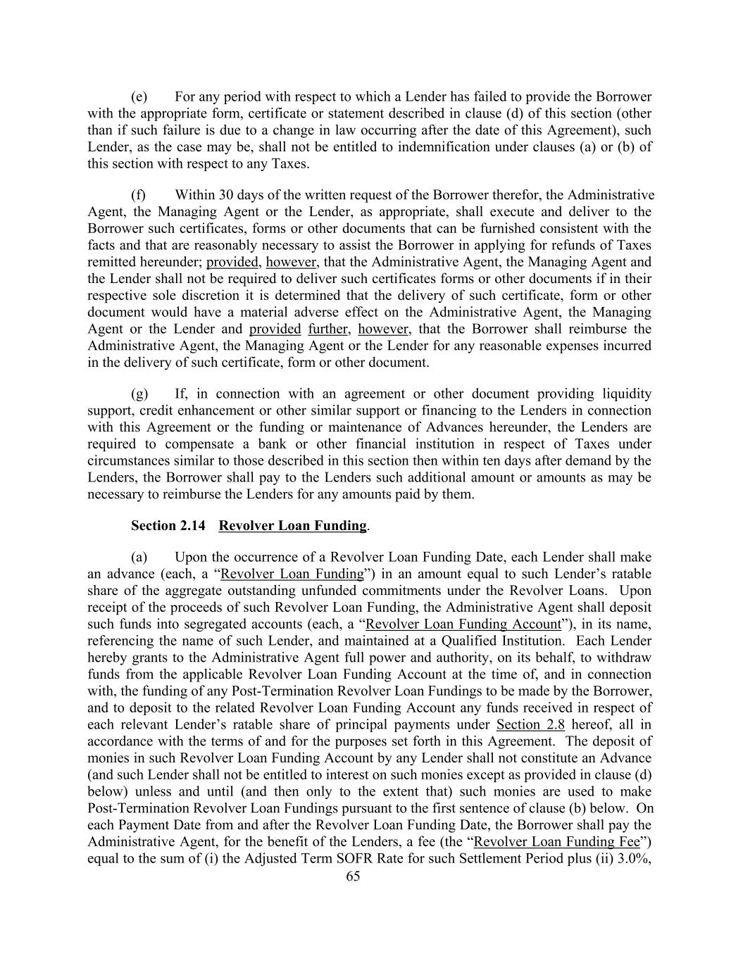 (e)就贷款人未能向借款人提供本条(d)条所述的适当表格、证书或陈述的任何期间(除非该等未能提供是由于在本协议日期后发生的法律变更),该贷款人(视属何情况而定)无权根据本条(a)或(b)条就任何税项获得弥偿。(f)在借款人提出书面要求后30天内,行政代理人、管理代理人或贷款人(视情况而定)应签立并向借款人交付能够提供的与事实相符的、为协助借款人申请退还根据本协议汇出的税款而合理必要的证明、表格或其他文件;但条件是,行政代理人,如果管理代理人和贷款人各自酌情决定交付此类证书、表格或其他文件将对行政代理人、管理代理人或贷款人产生重大不利影响,但进一步规定借款人应偿还行政代理人、管理代理人或贷款人在交付此类证书、表格或其他文件方面发生的任何合理费用,则不应要求其交付此类证书、表格或其他文件。(g)如果就与本协议有关的向贷款人提供流动性支持、信用增进或其他类似支持或融资的协议或其他文件或根据本协议为垫款提供资金或维持的情况,要求贷款人在与本节所述情况类似的情况下就税款补偿银行或其他金融机构,则在贷款人提出要求后十天内,借款人应向贷款人支付可能需要的额外金额或金额,以偿还贷款人所支付的任何金额。第2.14款循环贷款资金。(a)一旦出现循环贷款供资日期,每个贷款人应提供一笔预付款(每笔为“循环贷款供资”),数额相当于该贷款人在循环贷款项下未供资承付款项总额中的应课税份额。行政代理人收到此种循环贷款资金的收益后,应将此种资金存入独立的账户(每个账户,一个“循环贷款资金账户”),以其名义,参照该贷款人的名义,并在合格机构进行维护。每一贷款人特此授予行政代理人充分权力和授权,代表其在借款人将作出的任何终止后循环贷款资金的资金提供时以及与此有关的情况下从适用的循环贷款资金账户中提取资金,并将就每一相关贷款人根据本协议第2.8节在本金支付中的应课税份额而收到的任何资金存入相关的循环贷款资金账户,所有这些都符合本协议的条款并为本协议规定的目的。任何贷款人将款项存入该循环贷款资金账户不应构成垫款(且除下文(d)条规定的情况外,该贷款人无权获得该等款项的利息),除非且直至(然后仅限于)该等款项根据下文(b)条第一句用于提供终止后循环贷款资金。自循环贷款融资日期起及之后的每个付款日期,借款人应为贷款人的利益向行政代理人支付一笔费用(“循环贷款融资费用”),该费用等于(i)该结算期的调整后期限SOFR利率加上(ii)3.0%的总和,65