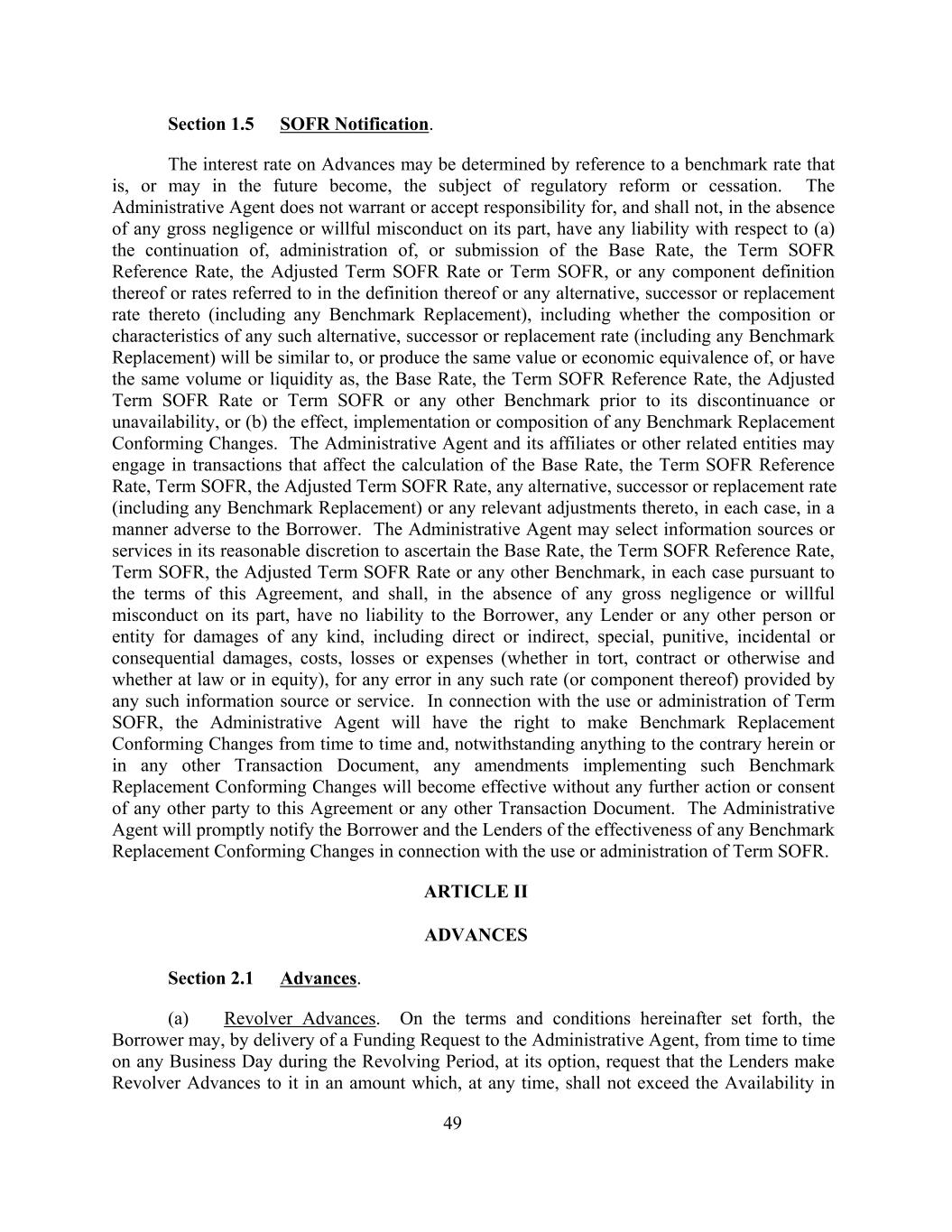 第1.5节SOFR通知。垫款利率可参照基准利率确定,该基准利率是或将来可能成为监管改革或停止的对象。行政代理人不保证或承担责任,且在其没有任何重大疏忽或故意不当行为的情况下,不对(a)基本利率、定期SOFR参考利率、调整后定期SOFR利率或定期SOFR的延续、管理或提交,或其定义中提及的任何组成部分定义或费率或其任何替代、继承或替代利率(包括任何基准替代)承担任何责任,包括任何此类替代的组成或特征,继任者或更换率(包括任何基准更换率)将与基本利率、定期SOFR参考利率、调整后的定期SOFR利率或定期SOFR或任何其他基准在其终止或不可用之前相似,或产生相同的价值或经济等价物,或具有相同的数量或流动性,或(b)任何基准更换率的效果、实施或构成符合变化。行政代理人及其附属机构或其他相关实体可以在每种情况下以对借款人不利的方式从事影响计算基本利率、定期SOFR参考利率、定期SOFR、调整后的定期SOFR利率、任何替代、继承或替代利率(包括任何基准替代)或对其进行任何相关调整的交易。行政代理人可根据本协议的条款,在其合理的酌情权范围内选择信息来源或服务,以确定基本利率、定期SOFR参考利率、定期SOFR、调整后的定期SOFR利率或任何其他基准,并且在其本人没有任何重大过失或故意不当行为的情况下,对借款人、任何贷款人或任何其他个人或实体不承担任何损害赔偿责任,包括直接或间接、特殊、惩罚性、附带或后果性损害、成本、损失或费用(无论是侵权行为,合同或其他,无论是在法律上还是在权益上),针对任何此类信息源或服务提供的任何此类费率(或其组成部分)中的任何错误。就Term SOFR的使用或管理而言,行政代理人将有权不时进行基准替换符合性变更,尽管本文或任何其他交易文件中有任何相反的规定,但实施此类基准替换符合性变更的任何修订将在无需本协议或任何其他交易文件的任何其他方采取任何进一步行动或同意的情况下生效。行政代理人将及时通知借款人和贷款人与使用或管理定期SOFR相关的任何基准替换符合性变更的有效性。第二条垫付2.1节预付款。(a)左轮手枪预付款。根据以下规定的条款和条件,借款人可在循环期内的任何营业日不时通过向行政代理人交付资金请求,根据其选择,要求贷款人向其提供循环垫款,其金额在任何时候均不得超过49