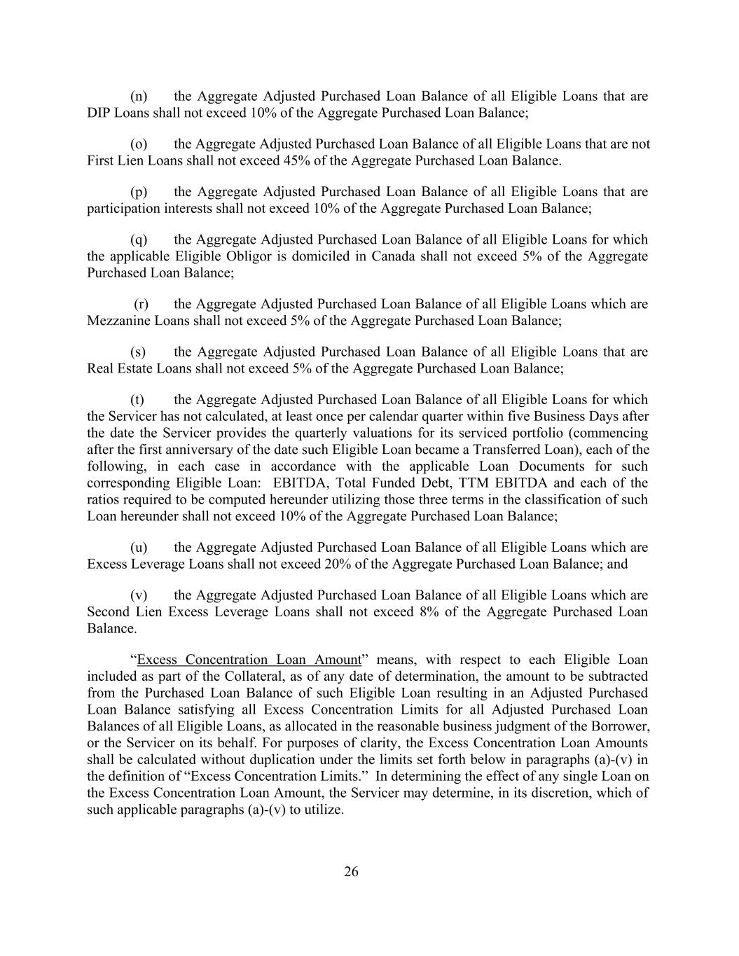 (n)属于DIP贷款的所有合格贷款的调整后购买贷款余额合计不得超过购买贷款余额合计的10%;(o)不属于第一留置权贷款的所有合格贷款的调整后购买贷款余额合计不得超过购买贷款余额合计的45%。(p)属于参与权益的所有合资格贷款的调整后购买贷款余额总额不得超过购买贷款余额总额的10%;(q)适用的合资格义务人在加拿大注册的所有合资格贷款的调整后购买贷款余额总额不得超过购买贷款余额总额的5%;(r)属于夹层贷款的所有合资格贷款的调整后购买贷款余额总额不得超过购买贷款余额总额的5%;(s)所有合资格贷款的调整后购买贷款余额总额即房地产贷款不得超过所购贷款余额总额的5%;(t)服务商未计算的所有合格贷款的调整后已购贷款余额总额,在服务商为其所服务的投资组合提供季度估值之日后的五个工作日内(自该合格贷款成为已转让贷款之日起一周年后开始),每个日历季度至少一次,以下每一项,在每种情况下均按照该相应合格贷款的适用贷款文件:EBITDA,融资债务总额,TTM EBITDA以及本协议项下使用该等贷款分类中这三个术语需要计算的各项比率,不得超过总购买贷款余额的10%;(u)属于超额杠杆贷款的所有符合条件的贷款的调整后总购买贷款余额不得超过总购买贷款余额的20%;(v)属于第二留置权超额杠杆贷款的所有符合条件的贷款的调整后总购买贷款余额不得超过总购买贷款余额的8%。“超额集中贷款金额”是指,就作为抵押品一部分包括的每笔合格贷款而言,截至任何确定日期,从该合格贷款的已购贷款余额中减去的金额导致调整后的已购贷款余额满足所有合格贷款的所有调整后已购贷款余额的所有超额集中限制,按借款人或代其分配的服务人的合理商业判断进行分配。为明确起见,超额集中贷款金额应在下文(a)-(v)段“超额集中限额”定义中规定的限额下计算,不得重复。在确定任何单一贷款对超额集中贷款金额的影响时,服务人可酌情决定使用该等适用的(a)-(v)款中的哪一款。26