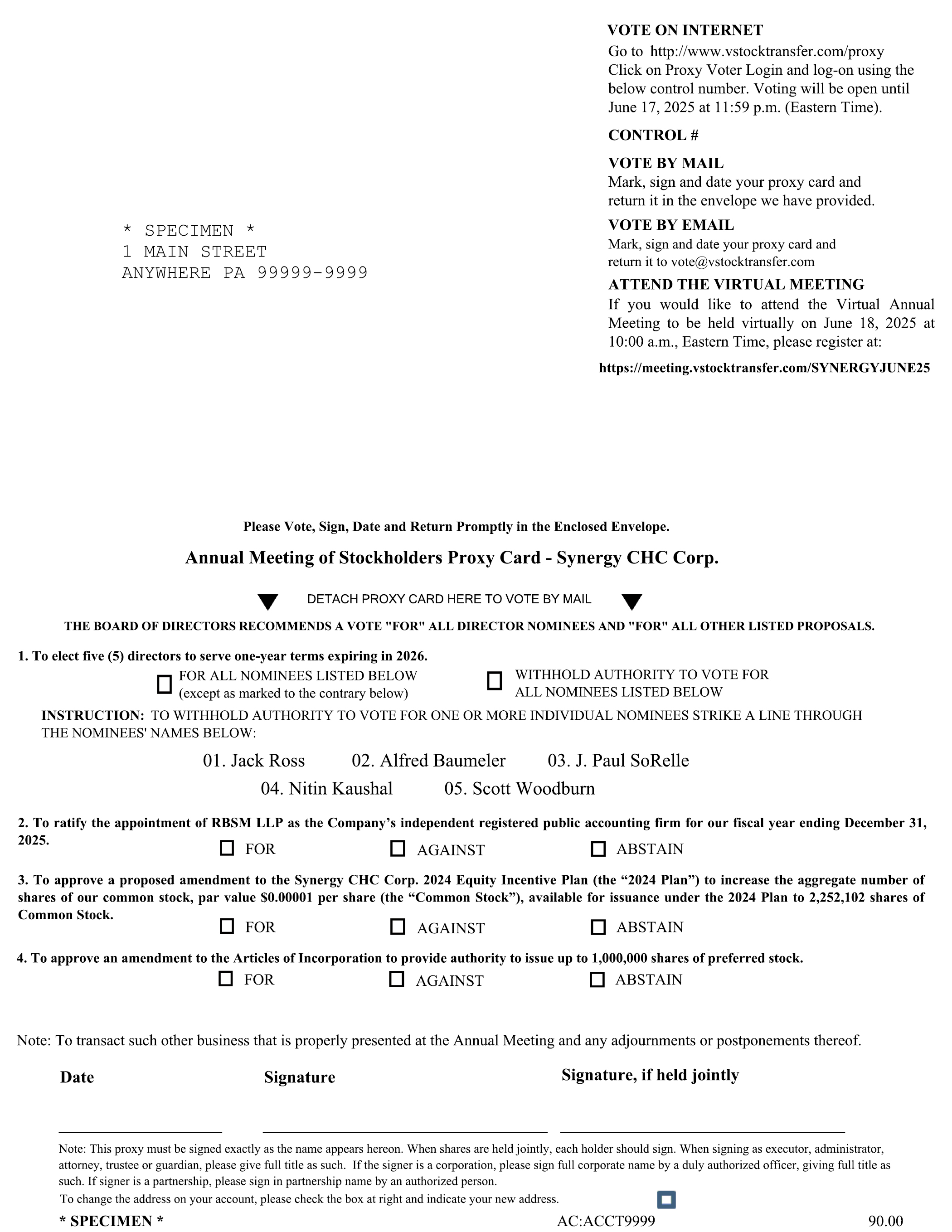 *规格*1条主街任何地方PA 99999-9999在互联网上投票请访问http://www.vstocktransfer.com/proxy点击代理选民登录并使用以下控制号码登录。投票将开放至2025年6月17日晚上11:59(美国东部时间)。控制#通过邮件标记进行投票,在您的代理卡上签名并注明日期,并将其放入我们提供的信封中退回。电子邮件投票标记、签名并注明日期您的代理卡并交回vote@vstocktransfer.com出席虚拟会议如您希望参加于美国东部时间2025年6月18日上午10:00举行的虚拟年会,请在以下网址登记:https://meeting.vstocktransfer.com/synergyJUNE25请在随附的信封中及时投票、签名、注明日期并返回。年度股东大会代理卡-Synergy CHC Corp. DETACH代理卡在这里通过邮寄方式投票董事会建议对所有董事提名人和所有其他列出的提案投“赞成”票。1.选举五(5)名董事,任期一年,2026年届满。为以下所列所有被提名人(以下注明相反的除外)放弃为以下所列所有被提名人投票的权力说明:放弃为一个或多个个人被提名人投票的权力通过以下被提名人的姓名划线:01。杰克·罗斯02。阿尔弗雷德·鲍梅勒03。J·保罗·索雷勒04。Nitin Kaushal 05。斯科特·伍德本2。批准委任RBSM LLP为公司截至2025年12月31日止财政年度的独立注册会计师事务所。反对弃权3。批准对《Synergy CHC公司2024年股权激励计划》(“2024年计划”)的拟议修订,以将根据2024年计划可供发行的普通股(每股面值0.00001美元)的股份总数(“普通股”)增加到2,252,102股普通股。反对弃权4。批准修订公司章程,以授权发行最多1,000,000股优先股。反对弃权注:处理在年度会议上适当提出的其他事务及其任何休会或延期。日期签名签名,如果联名持有注:此代理签名必须与此处出现的名称完全一致。共同持股时,各持有人应签字。作为被执行人、管理人、代理律师、受托人或监护人签字时,请提供完整的所有权。如签字人是法团,请由正式授权人员签署公司全名,并给予全称。如签字人为合伙企业,请经授权人签入合伙企业名称。要更改您账户上的地址,请勾选右侧方框,并注明您的新地址。*规格*AC:ACCT9999 90.00