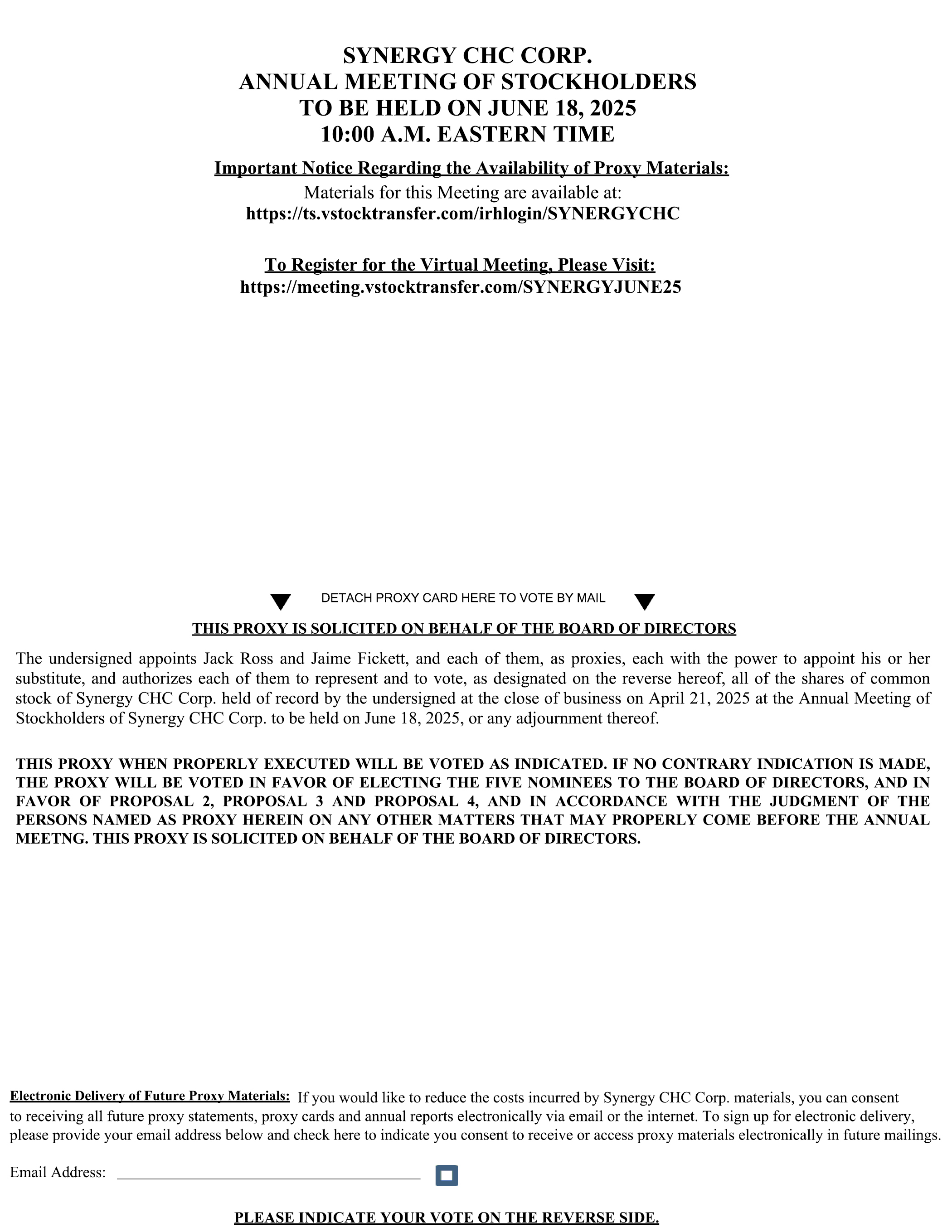 诚邀您参加将于2025年6月18日(星期三)美国东部时间上午10:00举行的内华达州公司Synergy CHC Corp.(“公司”)2025年年度股东大会(“年度会议”)。年会将是一次虚拟的股东大会,将完全通过网络直播的远程通讯方式进行。就出席年会而言,本代理声明中所有提及的“亲自出席”或“亲自出席”均指以虚拟方式出席年会。