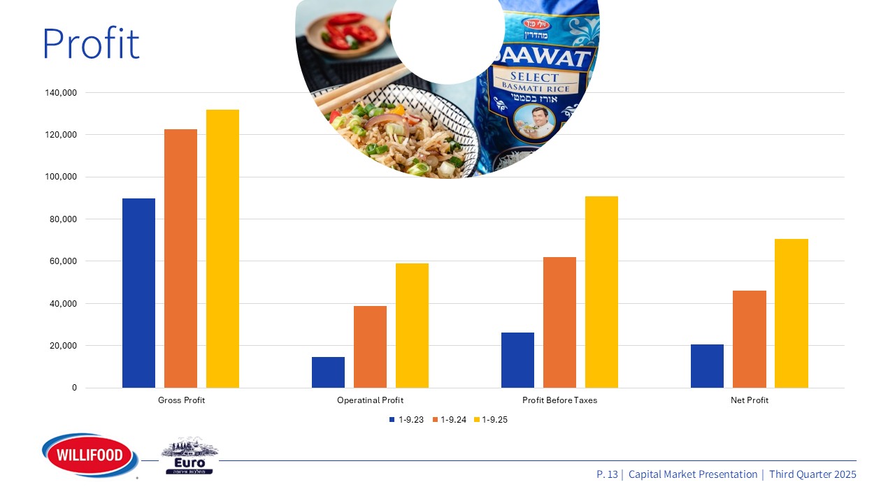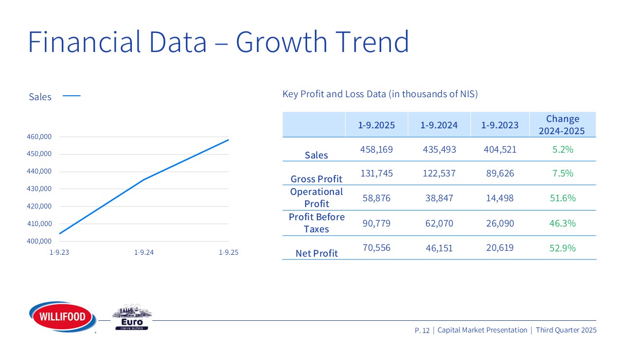 2025年第三季度|资本市场说明会| P.10财务数据–增长趋势销售额2025财年销售额来自2025年上半年主要损益数据(以千新谢克尔计)变化2023-2024 20242023202220216.0% 575,795543,262498,325454,213销售额33.8% 161,334120,569143,097138,293毛利润*169.1% 66,27620,35045,09649,355营业利润*136.5% 104,08439,19253,97457,820税前利润*121.8% 81,71731,65641,56445,101净利润**不包括一次性费用