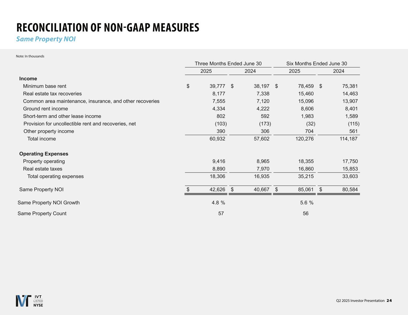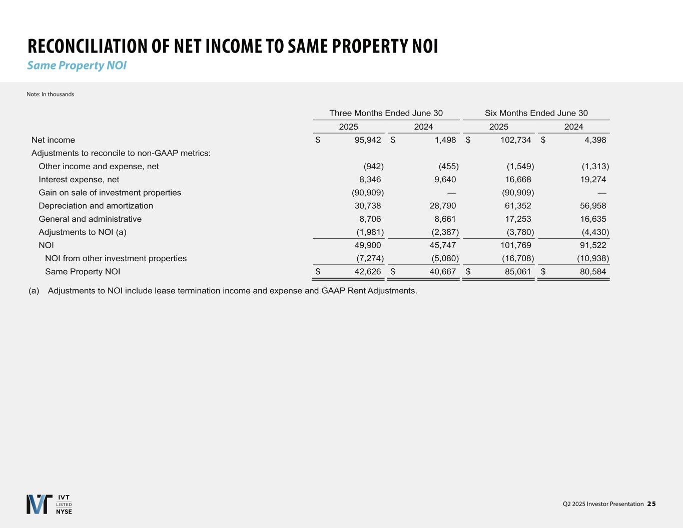 2025年第二季度投资者介绍24非公认会计原则措施的调节相同财产NOI注:以千为单位的非公认会计原则措施的调节以千为单位6补充-截至2025年6月30日的季度相同财产NOI截至6月30日的三个月2025年6月30日的六个月202420252024收入最低基本租金39,777美元38,197美元78,459美元75,381美元房地产税回收8,1777,33815,46014,463公共区域维护、保险、及其他收回款项7,5557,12015,09613,907地租收入4,3344,2228,6068,401短期及其他租赁收入8025921,9831,589无法收回的租金及收回款项拨备,净额(103)(173)(32)(115)其他财产收入390306704561总收入60,93257,602120,276114,187营业费用物业经营9,4168,96518,35517,750房地产税8,8907,97016,86015,853总营业费用18,30616,93535,21533,603相同财产NOI $ 42,626 $ 40,667 $ 85,061 $ 80,584相同财产NOI增长4.8% 5.6%相同财产计数5756截至6月30日的三个月净收入NOI截至6月30日的六个月2025202420252024净收入95,942美元1,498美元102,734美元4,398调整以符合非公认会计原则指标:其他收入和支出净额(942)(455)(1,549)(1,313)利息支出净额8,3469,64016,66819,274出售投资物业收益(90,909)—(90,909)—折旧和摊销30,73828,79061,35256,958一般和行政8,7068,66117,25316,635调整NOI(a)(1,981)(2,387)(3,780)(4,430)NOI 49,90045,747101,76991,522其他投资物业NOI(7,274)(5,080)(16,708)(10,938)相同物业NOI $ 42,626 $ 40,667 $ 85,061 $ 80,584