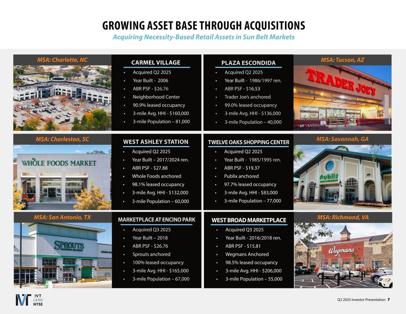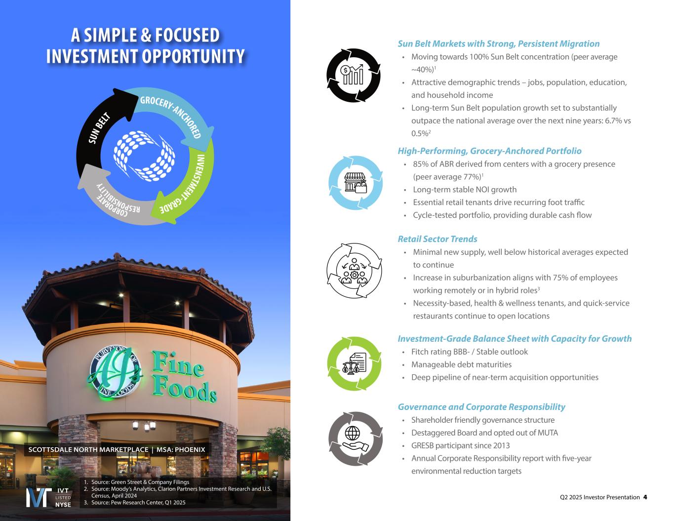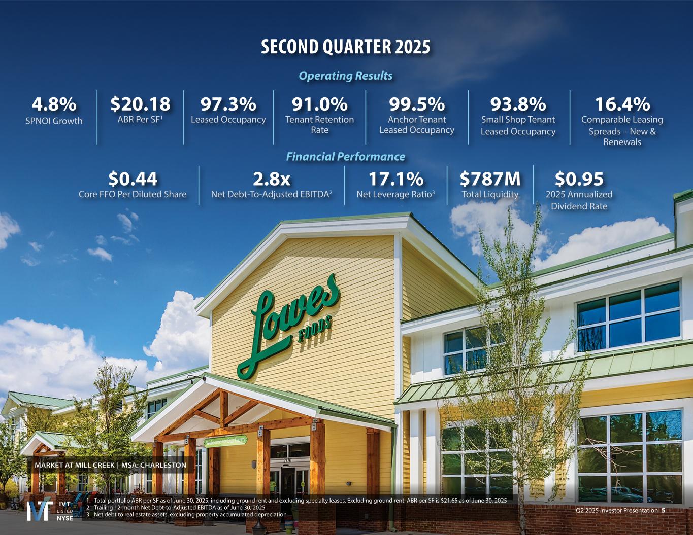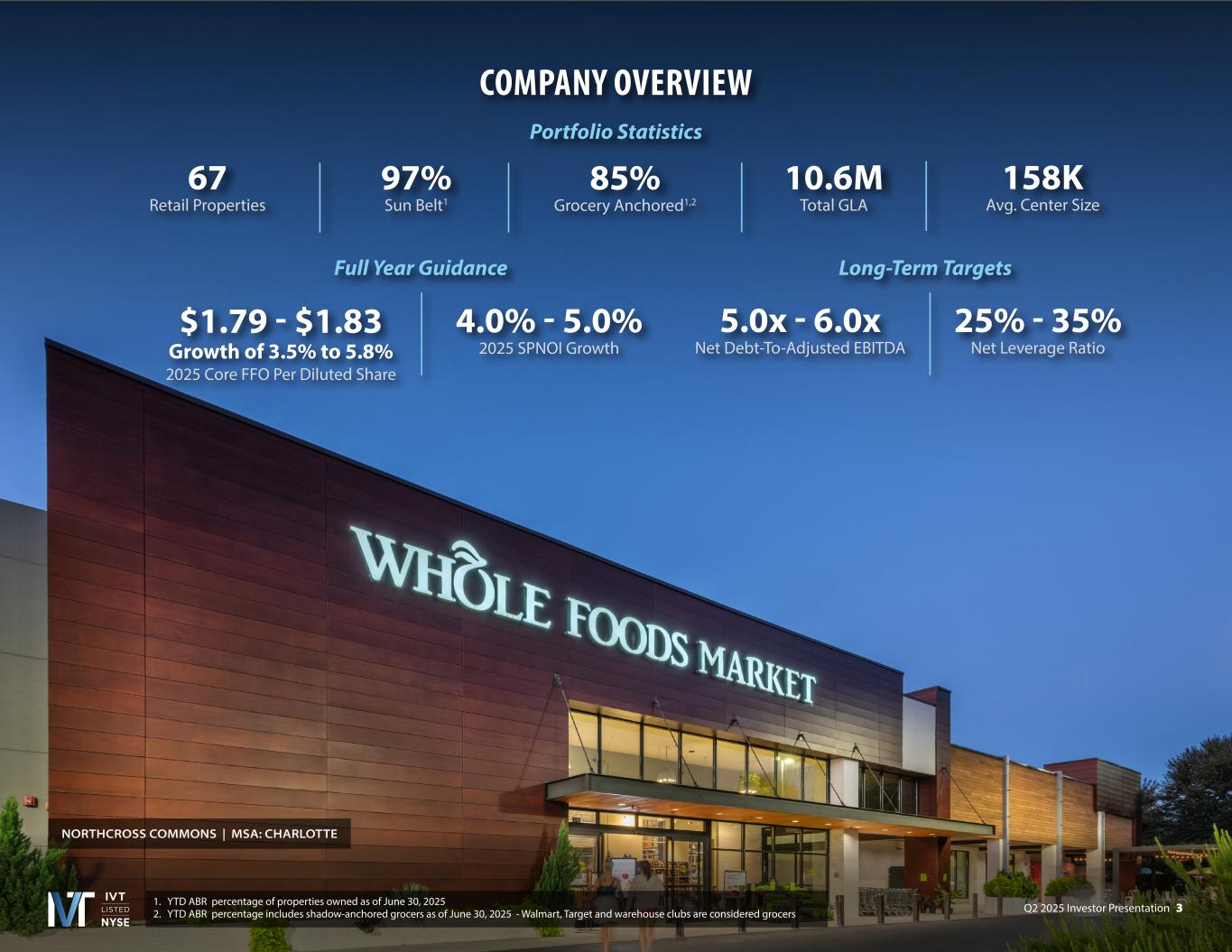 2025年第二季度投资者介绍会2介绍说明前瞻性陈述免责声明本介绍中的前瞻性陈述不是历史事实,属于1995年《私人证券诉讼改革法案》含义内的前瞻性陈述。这些陈述是基于InventTrust管理层当前的信念和期望,并受到重大风险和不确定性的影响。实际结果可能与前瞻性陈述中描述的结果存在重大差异。本补充文件中的任何非历史事实陈述的陈述,包括关于我们的信念和期望的陈述,均为前瞻性陈述。前瞻性陈述包括有关可能或假定的未来运营结果的信息,包括我们对业务计划和战略的指导和描述。这些声明通常包括“可能”、“应该”、“可以”、“将”、“预期”、“打算”、“计划”、“寻求”、“预期”、“相信”、“估计”、“目标”、“项目”、“预测”、“潜力”、“继续”、“可能”、“将”、“预测”、“展望”、“指导”、“建议”等词语,以及这些术语和类似表达的变体,或这些术语或类似表达的否定。除其他外,以下因素可能导致某些事件的实际结果、财务状况和时间与前瞻性陈述中描述的存在重大差异:利率变动;地方、区域、国家和全球经济表现;通货膨胀对公司及其租户的影响;竞争因素;电子商务对零售业的影响;未来零售商门店关闭;零售商整合;零售商缩小门店规模;零售商破产;政府政策变化,包括最近新的关税和全球贸易政策变化对整体经济状况的影响;以及可能影响公司经营战略的任何重大市场变化和趋势。有关可能对管理层前瞻性陈述的结果以及IVT未来业绩和财务状况产生重大影响的因素的进一步讨论,请参阅公司最近的10-K表格年度报告中包含的风险因素,该报告由随后提交给SEC的任何10-Q表格季度报告更新。InventTrust打算使此类前瞻性陈述受经修订的1933年证券法第27A条和经修订的1934年证券交易法第21E条创建的安全港的约束,但适用法律可能要求的除外。IVT提醒您不要过分依赖任何前瞻性陈述,这些陈述是在本演示文稿发布之日作出的。IVT不承担公开更新任何这些前瞻性陈述以反映实际结果、新信息或未来事件、假设变化或影响前瞻性陈述的其他因素变化的义务,除非适用法律要求。如果IVT更新一项或多项前瞻性陈述,则不应推断IVT将对这些或其他前瞻性陈述进行额外更新。商标此处照片中描述的公司,或公司在本演示文稿中引用的任何第三方商标,包括名称、徽标和品牌,均为其各自所有者的财产。所有对第三方商标的引用仅用于识别目的,本文中的任何内容均不应被视为各公司对InventTrust Properties Corp.的背书、授权或批准。此外,这些公司均未以任何方式与公司有任何关联。