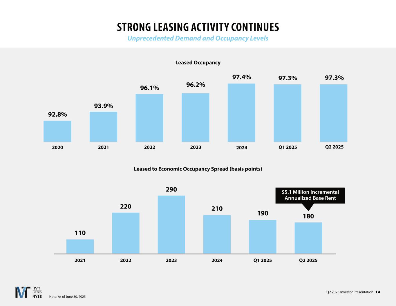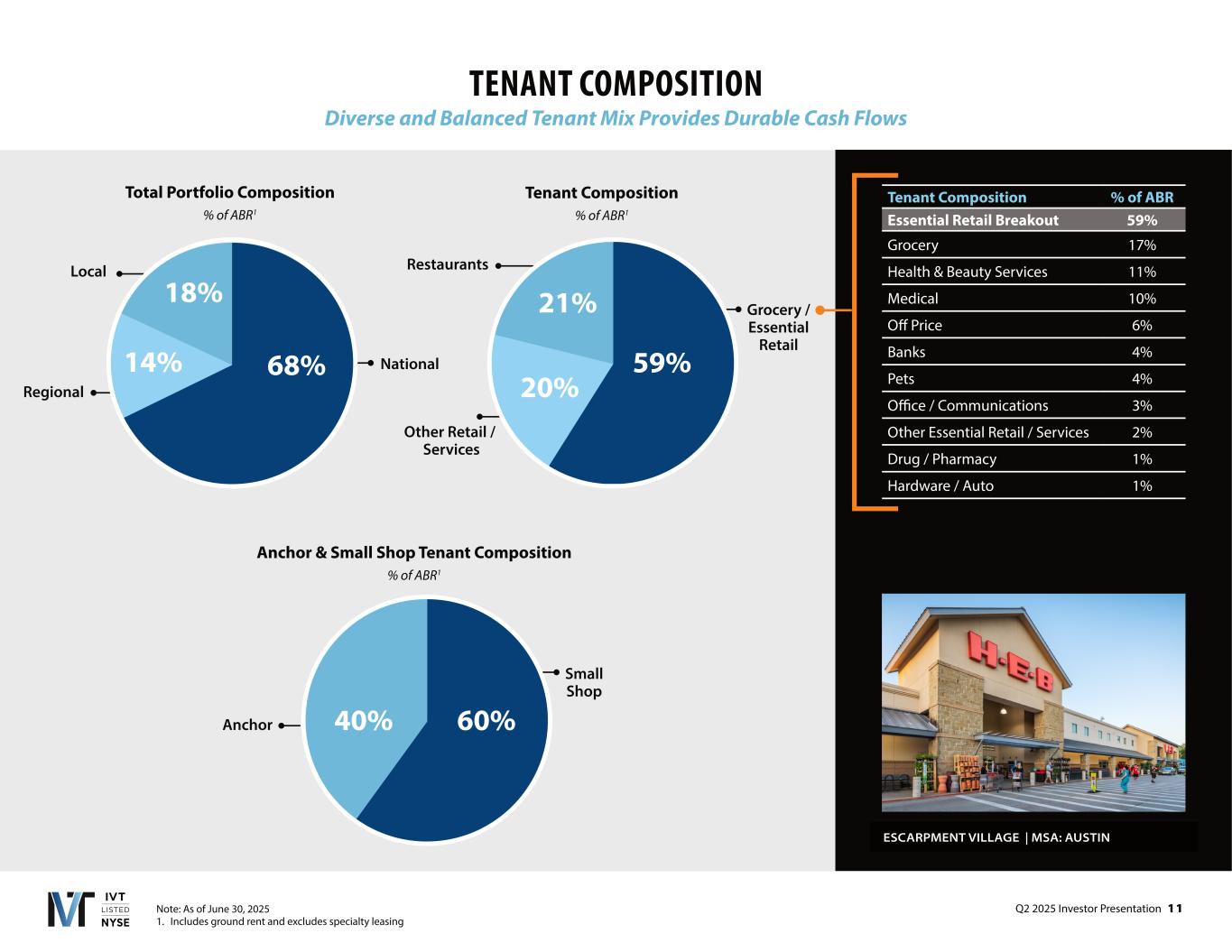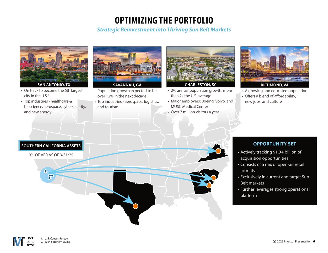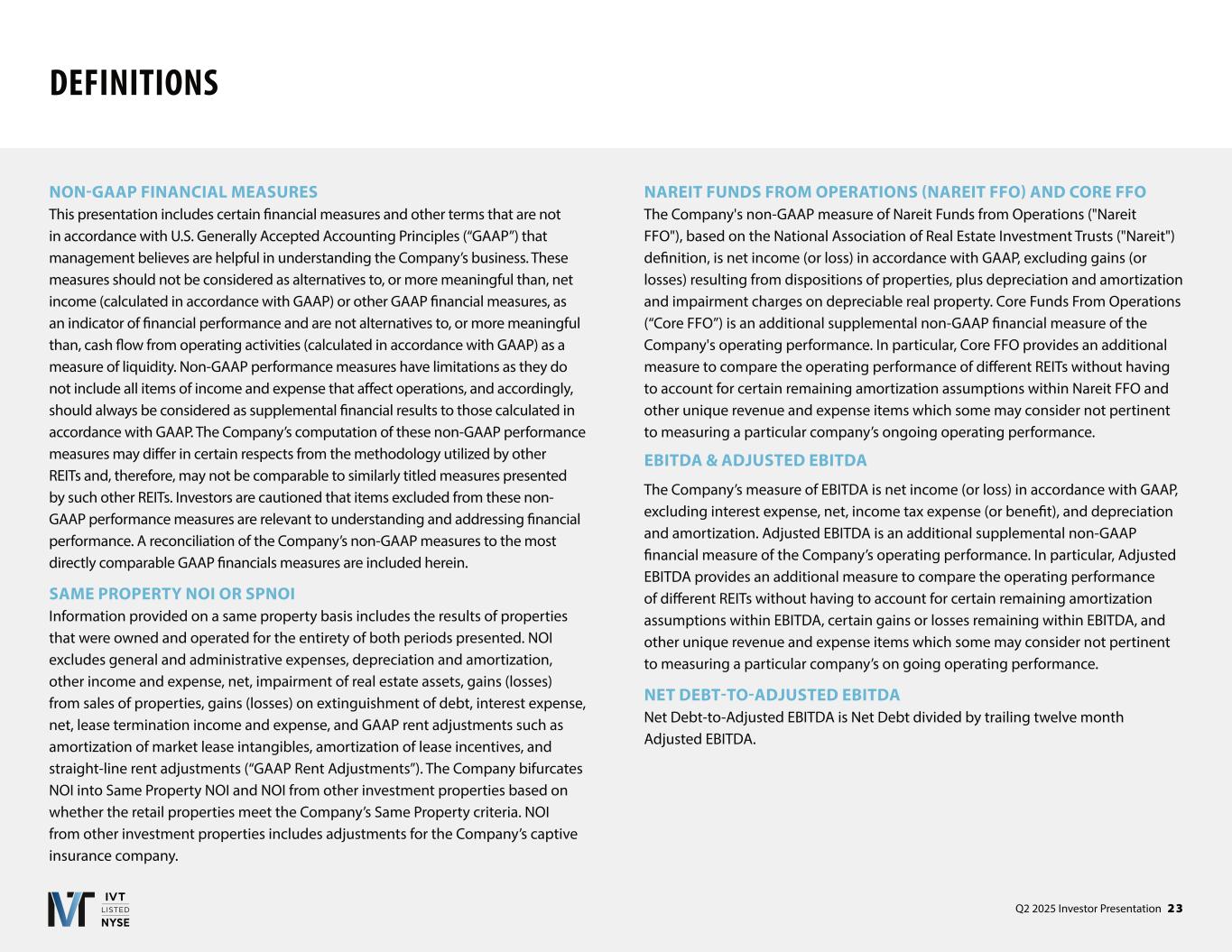 2025年第二季度投资者介绍会2介绍说明前瞻性陈述免责声明本介绍中的前瞻性陈述不是历史事实,属于1995年《私人证券诉讼改革法案》含义内的前瞻性陈述。这些陈述是基于InventTrust管理层当前的信念和期望,并受到重大风险和不确定性的影响。实际结果可能与前瞻性陈述中描述的结果存在重大差异。本补充文件中的任何非历史事实陈述的陈述,包括关于我们的信念和期望的陈述,均为前瞻性陈述。前瞻性陈述包括有关可能或假定的未来运营结果的信息,包括我们对业务计划和战略的指导和描述。这些声明通常包括“可能”、“应该”、“可以”、“将”、“预期”、“打算”、“计划”、“寻求”、“预期”、“相信”、“估计”、“目标”、“项目”、“预测”、“潜力”、“继续”、“可能”、“将”、“预测”、“展望”、“指导”、“建议”等词语,以及这些术语和类似表达的变体,或这些术语或类似表达的否定。除其他外,以下因素可能导致某些事件的实际结果、财务状况和时间与前瞻性陈述中描述的存在重大差异:利率变动;地方、区域、国家和全球经济表现;通货膨胀对公司及其租户的影响;竞争因素;电子商务对零售业的影响;未来零售商门店关闭;零售商整合;零售商缩小门店规模;零售商破产;政府政策变化,包括最近新的关税和全球贸易政策变化对整体经济状况的影响;以及可能影响公司经营战略的任何重大市场变化和趋势。有关可能对管理层前瞻性陈述的结果以及IVT未来业绩和财务状况产生重大影响的因素的进一步讨论,请参阅公司最近的10-K表格年度报告中包含的风险因素,该报告由随后提交给SEC的任何10-Q表格季度报告更新。InventTrust打算使此类前瞻性陈述受经修订的1933年证券法第27A条和经修订的1934年证券交易法第21E条创建的安全港的约束,但适用法律可能要求的除外。IVT提醒您不要过分依赖任何前瞻性陈述,这些陈述是在本演示文稿发布之日作出的。IVT不承担公开更新任何这些前瞻性陈述以反映实际结果、新信息或未来事件、假设变化或影响前瞻性陈述的其他因素变化的义务,除非适用法律要求。如果IVT更新一项或多项前瞻性陈述,则不应推断IVT将对这些或其他前瞻性陈述进行额外更新。商标此处照片中描述的公司,或公司在本演示文稿中引用的任何第三方商标,包括名称、徽标和品牌,均为其各自所有者的财产。所有对第三方商标的引用仅用于识别目的,本文中的任何内容均不应被视为各公司对InventTrust Properties Corp.的背书、授权或批准。此外,这些公司均未以任何方式与公司有任何关联。