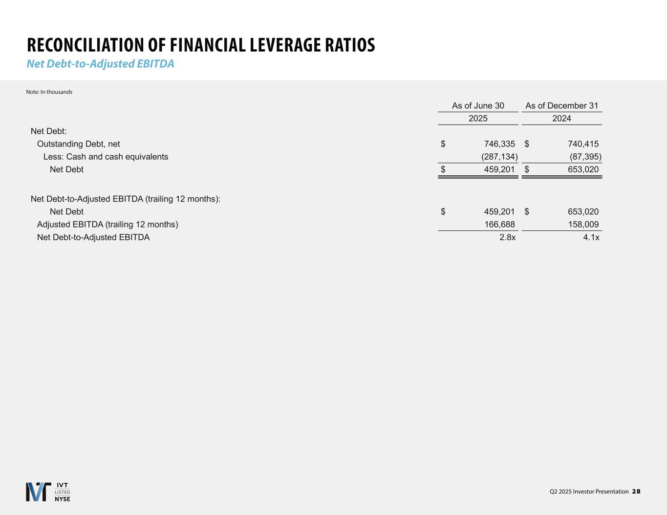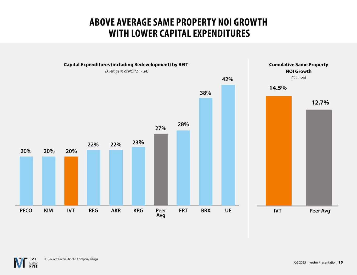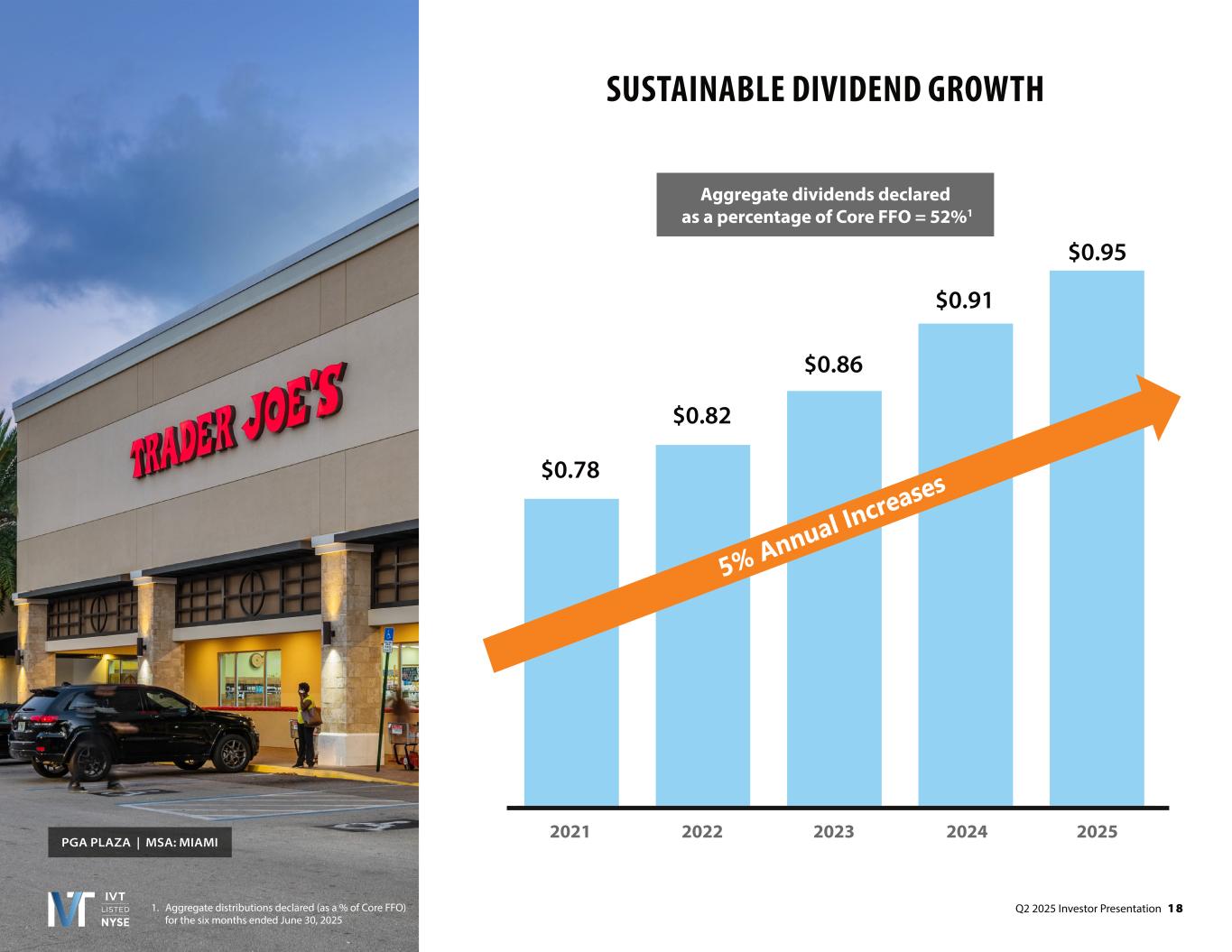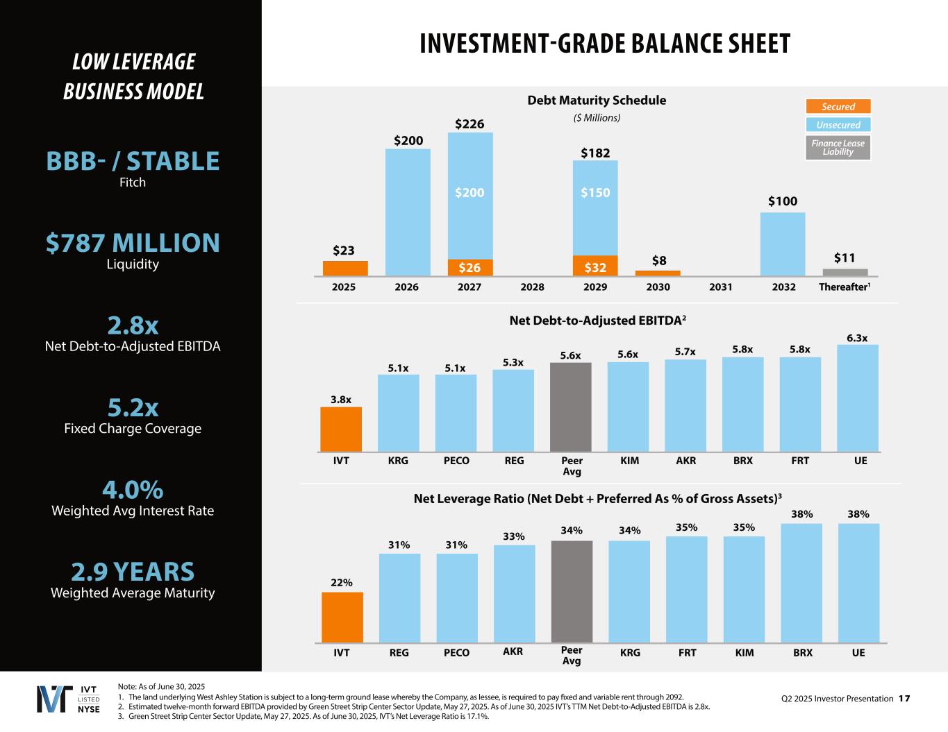 2025年第二季度投资者说明会17 IVT同行Avg BRXREGPECO KIMKRG AKRFRT UE投资-等级资产负债表1。西阿什利站的底层土地受长期地面租赁的约束,据此,公司作为承租人须支付固定和可变租金至2092年。2.预计十二个月远期EBITDA由Green Street Strip Center Sector Update提供,2025年5月27日。截至2025年6月30日,IVT的TTM净债务与调整后EBITDA之比为2.8x.3。Green Street Strip Center Sector Update,May 27,2025。截至2025年6月30日,IVT的净杠杆率为17.1%。BBB-/稳定惠誉7.87亿美元流动性2.8倍净债务调整后EBITDA 5.2倍固定费用覆盖率4.0%加权平均利率2.9年加权平均期限202820302031有担保无担保2025美元232026美元2002027美元226美元200美元262029美元182美元150美元32美元2032美元100美元注:截至6月30日,2025年净杠杆率(净债务+优先占总资产的百分比)331% 31% 22%净债务与调整后EBITDA2之比3.8x 5.1x5.1x 5.3x 5.6x低杠杆商业模型债务到期时间表(百万美元)5.7x 5.8x 5.8x 6.3x IVT REG PECO 34% KRG 34% AKR 35% FRT 35% KIM 38% BRX 38% UEPeer Avg 33% 5.6x $ 11融资租赁负债此后1 $ 8