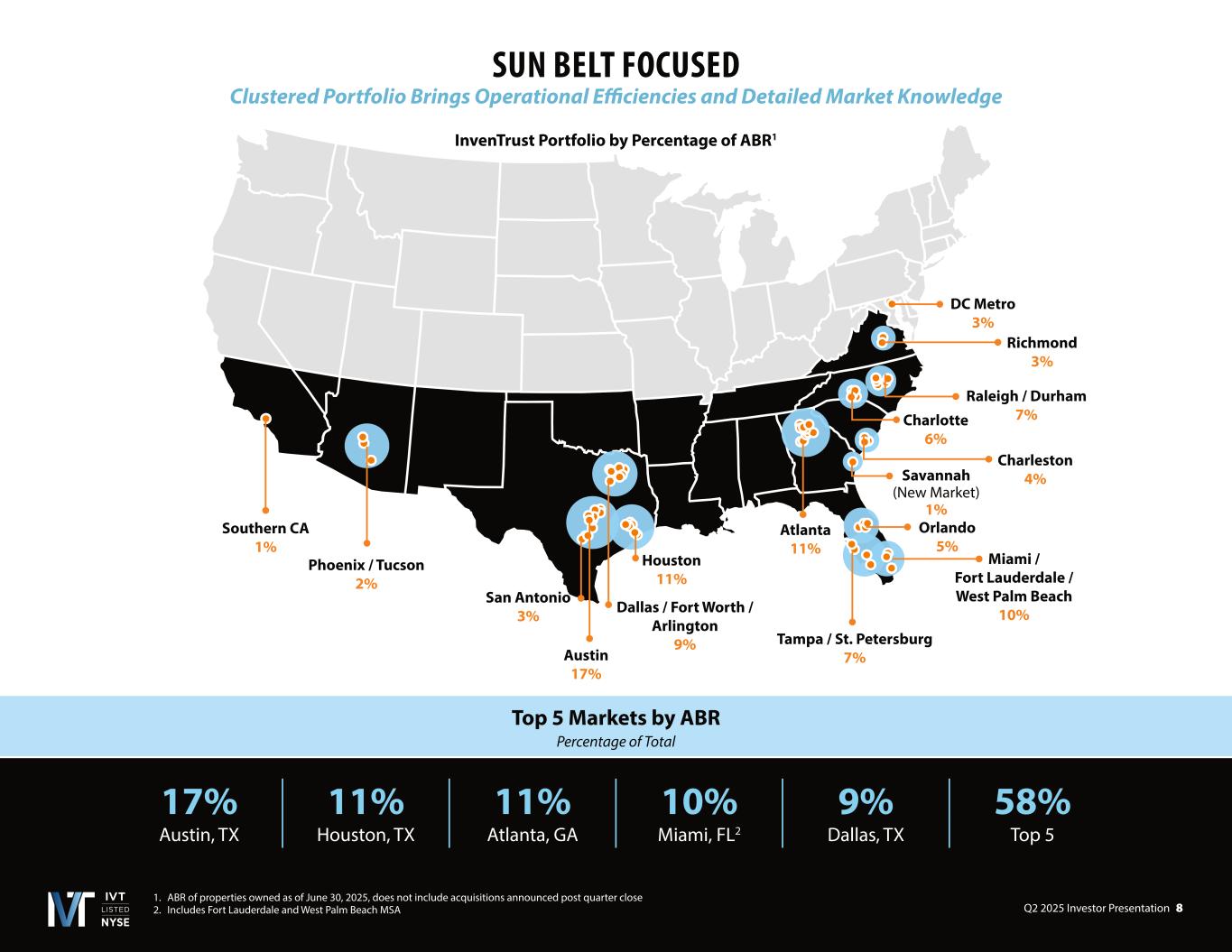 2025年第二季度投资者介绍会8南方加利福尼亚州 1%菲尼克斯/图森2%圣安东尼奥3%奥斯汀17%达拉斯/沃思堡/阿灵顿9%休斯顿11%坦帕/圣彼得堡7%迈阿密/劳德代尔堡/西棕榈滩10%奥兰多5%夏洛特6%罗利/达勒姆7%里士满3% DC Metro 3%查尔斯顿4%亚特兰大11% SUN BELT专注的集群投资组合带来运营效率和详细的市场知识1。截至2025年6月30日所拥有物业的ABR不包括季度结束后宣布的收购2。包括劳德代尔堡和西棕榈滩MSA ABR占InventTrust总投资组合的百分比ABR1前5名市场17% 11% 11% 11% 10% 9% 58%德克萨斯州奥斯汀休斯顿、德克萨斯州亚特兰大、佐治亚州迈阿密、FL2达拉斯、德克萨斯州前5名萨凡纳(新市场)1%