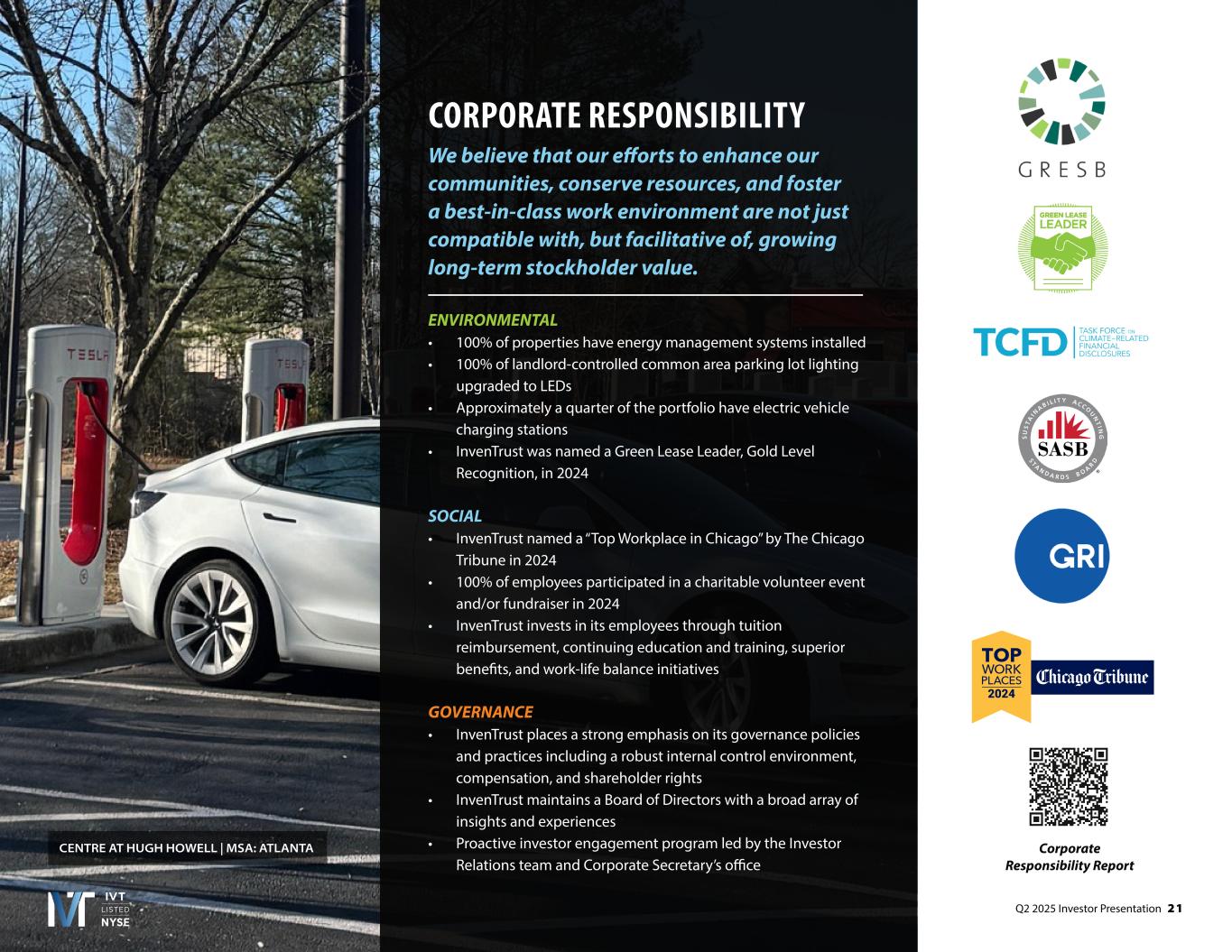 2025年第二季度投资者介绍21企业责任我们认为,我们为增强社区、节约资源和营造一流的工作环境所做的努力,不仅与不断增长的长期股东价值相适应,而且为其提供了便利。Environmental • 100%的物业安装了能源管理系统• 100%房东控制的公共区域停车场照明升级为LED •约四分之一的投资组合拥有电动汽车充电站• InventTrust在2024年被评为绿色租赁领导者,金级认可SOCIAL • InventTrust在2024年被《芝加哥论坛报》评为“芝加哥顶级工作场所”• 2024年100%的员工参加了慈善志愿者活动和/或筹款活动• InventTrust通过报销学费、继续教育和培训、优越福利等方式对员工进行投资,治理和工作与生活平衡举措• InventTrust非常强调其治理政策和实践,包括稳健的内部控制环境、薪酬和股东权利• InventTrust维持着一个拥有广泛见解和经验的董事会•由投资者关系团队和公司秘书办公室牵头的积极主动的投资者参与计划公司责任报告中心在HUGH HOwell | MSA:亚特兰大