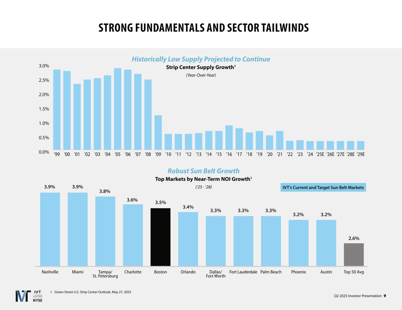 2025年第二季度投资者说明会9强基本面和行业顺风1。Green Street美国带状中心展望,2025年5月27日0.0 0.5 1.0 1.5 2.0 2.5 3.0‘29e’28e‘27e’26e‘25e’24‘23’22‘21’20‘19’18‘17’16‘15’14‘13’12‘11’10‘09’08‘07’06‘05’04‘03’02‘01’00 ' 990.0% 0.5% 1.5% 2.5% 1.0% 2.0% 3.0% IVT当前和目标太阳带市场50强AvgAustinPhoenixPalm BeachFort LauderdaleDallas/Fort Worth OrlandoBostonCharlotteTampa/St. Petersburg MiamiNashville 3.9% 3.9% 3.8% 3.5% 3.4% 3.3% 3.3% 3.3% 3.2% 3.2% 3.2% 2.6%历史性低供应预计将继续带状中心供应增长1(