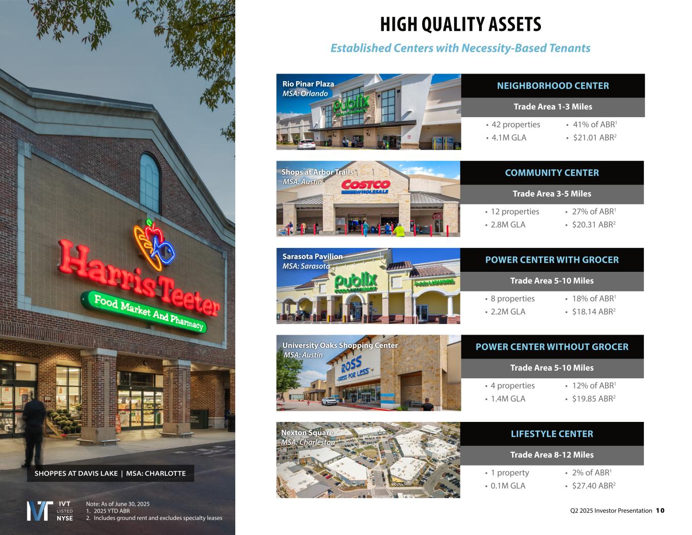 2025年第二季度投资者介绍会10带有Grocer贸易区的电力中心5-10英里• 8处房产• 220万GLA • ABR1的18% • 18.14美元ABR2萨拉索塔展馆MSA:戴维斯湖的萨拉索塔商店| MSA:夏洛特高质量资产建立了以需求为基础的租户中心注:截至2025年6月30日1。2025年初至今ABR 2。包括地租并且不包括没有Grocer贸易区5-10英里的专业租赁电力中心• 4处房产• 140万GLA • ABR1的12% • 19.85美元ABR2社区中心贸易区3-5英里• 12处房产• 280万GLA • ABR1的27% • Arbor Trails的ABR2商店20.31美元MSA:奥斯汀邻里中心贸易区1-3英里• 42处房产• 410万GLA • ABR1的41% • 21.01美元ABR2生活方式中心贸易区8-12英里• 1处房产• 0.10万GLA • ABR1的2% • 27.40美元ABR2 Nexton Square丨MSA丨:查尔斯顿大学OaAPlaza MSA:奥兰多