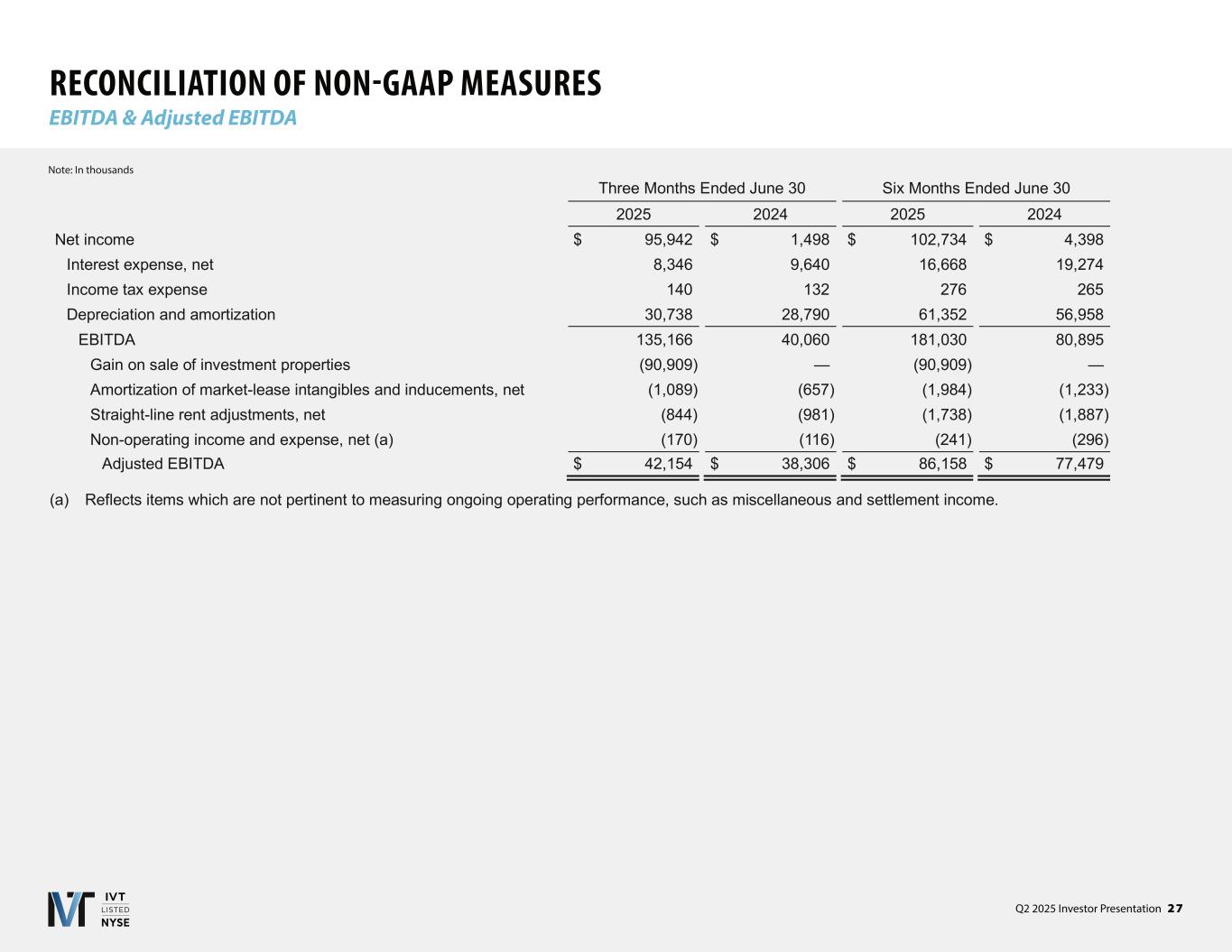 2025年第二季度投资者介绍26非公认会计原则措施的调节Nareit FFO & Core FFO注:以千为单位,除股份和每股金额外非公认会计原则措施的调节继续以千为单位,除股份和每股金额外7补充-截至6月30日的季度,2025 Nareit FFO和Core FFO截至6月30日的三个月2025202420252024净收入95,942美元1,498美元102,734美元4,398美元房地产资产折旧和摊销30,45128,57060,81756,516出售投资物业收益(90,909)—(90,909)—适用于普通股和稀释性证券的Nareit FFO 35,48430,06872,64260,914市场租赁无形资产和诱导的摊销净额(1,089)(657)(1,984)(1,233)直线租金调整,净额(844)(981)(1,738)(1,887)债务贴现和融资费用摊销6576001,3401,175融资租赁负债的增加11 — 11 —企业资产折旧和摊销287220535442营业外收入和费用,net(a)(170)(116)(241)(296)适用于普通股的核心FFO和稀释性证券34,336美元29,134美元70,565美元59,115美元加权平均已发行普通股-基本77,591,53867,900,27577,577,83167,887,402未归属限制性股票的稀释影响(b)700,884426,988648,850412,255加权平均已发行普通股-稀释后78,292,42268,327,26378,226,68168,299,657每股摊薄净收益1.23美元0.02美元1.31美元0.06美元Nareit FFO每股摊薄收益0.45美元0.44美元0.93美元0.89美元核心FFO每股摊薄收益0.44美元0.43美元0.90美元0.87美元(a)反映与衡量持续经营业绩无关的项目,例如杂项和结算收入。(b)为了计算非公认会计原则每股指标,公司采用了根据公认会计原则计算稀释每股收益时使用的相同分母。EBITDA和调整后EBITDA截至6月30日止三个月2025202420252024净收入$ 95,942 $ 1,498 $ 102,734 $ 4,398利息支出净额8,3469,64016,66819,274所得税支出140132276265折旧和摊销30,73828,79061,35256,958 EBITDA 135,16640,060181,03080,895出售投资物业收益(90,909)—(90,909)—市场租赁无形资产摊销和诱导,净额(1,089)(657)(1,984)(1,233)直线租金调整,净额(844)(981)(1,738)(1,887)营业外收入和支出,净额(a)(170)(116)(241)(296)调整后EBITDA 42,154美元38,306美元86,158美元77,479美元(a)反映与衡量持续经营业绩无关的项目,例如杂项和结算收入。