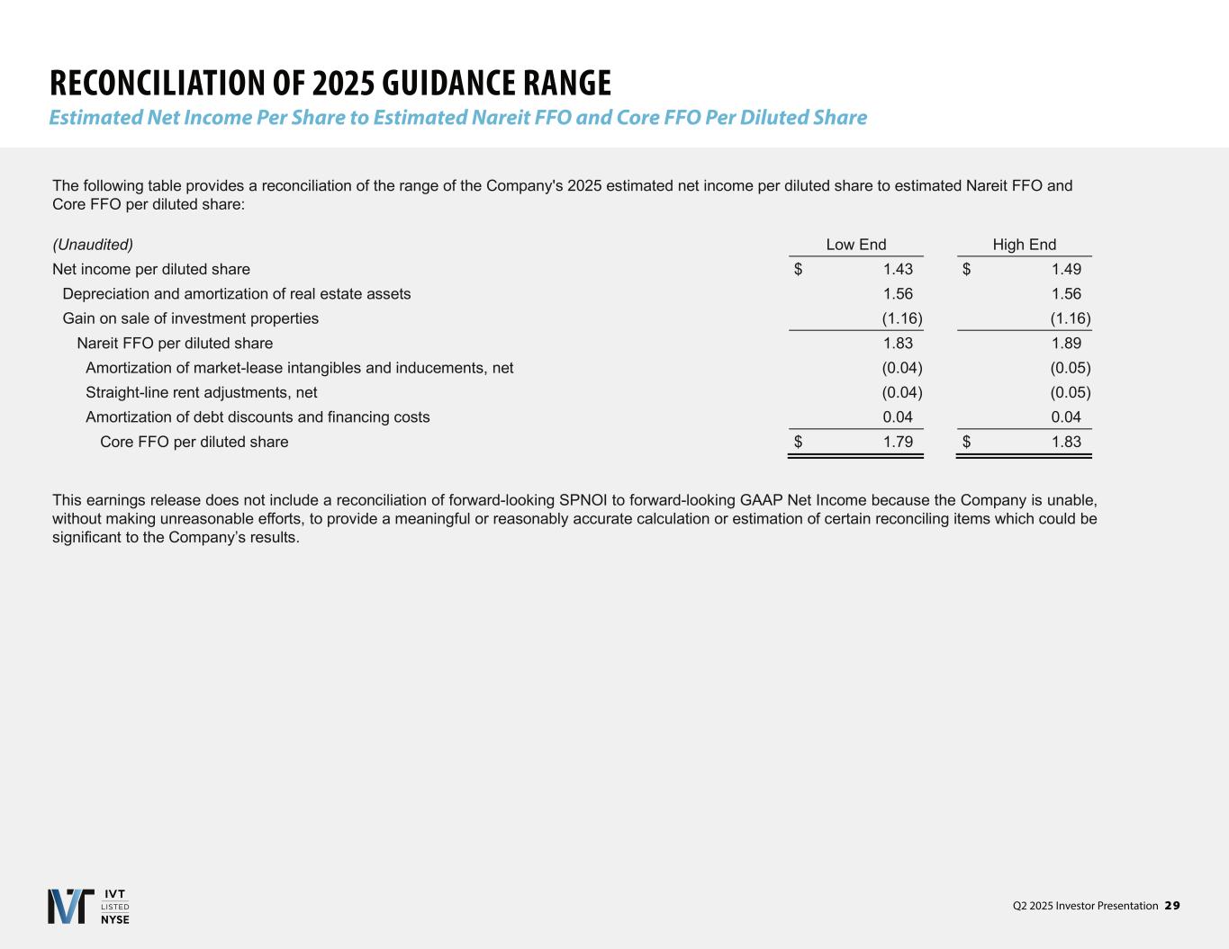 2025年第二季度投资者说明会29对2025年指引范围的调节估计每股净收益与估计的Nareit FFO和核心FFO每股稀释股份vi补充-截至2025年6月30日的季度2025年指引InventTrust更新了其2025年指引,汇总如下表。(未经审计,以千美元计,每股金额除外)当前(1)(2)先前每股摊薄净收益$ 1.43 — $ 1.49 $ 0.27 — $ 0.33 Nareit FFO每股摊薄收益$ 1.83 — $ 1.89 $ 1.83 — $ 1.89每股摊薄收益核心FFO(3)$ 1.79 — $ 1.83 $ 1.79 — $ 1.83 Same Property NOI(“SPNOI”)增长4.00% — 4.75% 3.50% — 4.50%一般和行政费用$ 34,250 — $ 35,750 $ 34,250 — $ 35,750利息费用,净额(4)$ 31,000 — $ 31,500 $ 31,000 — $ 31,500净投资活动(5)~$ 100,000~$ 100,000(1)公司2025年指引不包括与处置损益相关的预测,债务交易的收益或损失,以及与收购和处置相关的折旧、摊销和直线租金调整。(2)公司2025年指引包含无法收回的预期,反映为预期总收入的65-85个基点。(3)稀释后每股核心FFO不包括市场租赁无形资产摊销和诱导、债务清偿费用、直线租金调整、企业资产折旧和摊销以及营业外收入和费用。(4)利息支出净额,不包括债务折扣摊销和融资成本,预期利息收入约为280万美元。(5)净投资活动是指预期的收购活动减去处置活动。除上述假设外,公司2025年指引还纳入了许多其他可能发生变化且可能超出公司控制范围的假设。如果实际结果与这些假设不同,公司的预期可能会发生变化。不能保证InventTrust会取得这些结果。下表提供了公司2025年估计的每股摊薄净收益与估计的Nareit FFO和核心FFO每股摊薄收益范围的对账:(未经审计)低端高端每股摊薄净收益1.43美元1.49美元房地产资产折旧和摊销1.56 1.56出售投资物业的收益(1.16)(1.16)Nareit FFO每股摊薄收益1.83 1.89市场租赁无形资产和诱导的摊销净额(0.04)(0.05)直线租金调整,净(0.04)(0.05)债务折扣摊销和融资成本0.04 0.04核心FFO每股摊薄收益1.79美元1.83美元本财报不包括前瞻性SPNOI与前瞻性GAAP净收入的对账,因为公司无法在不做出不合理努力的情况下提供对某些对账项目的有意义或合理准确的计算或估计,而这些项目可能对公司的业绩具有重要意义。