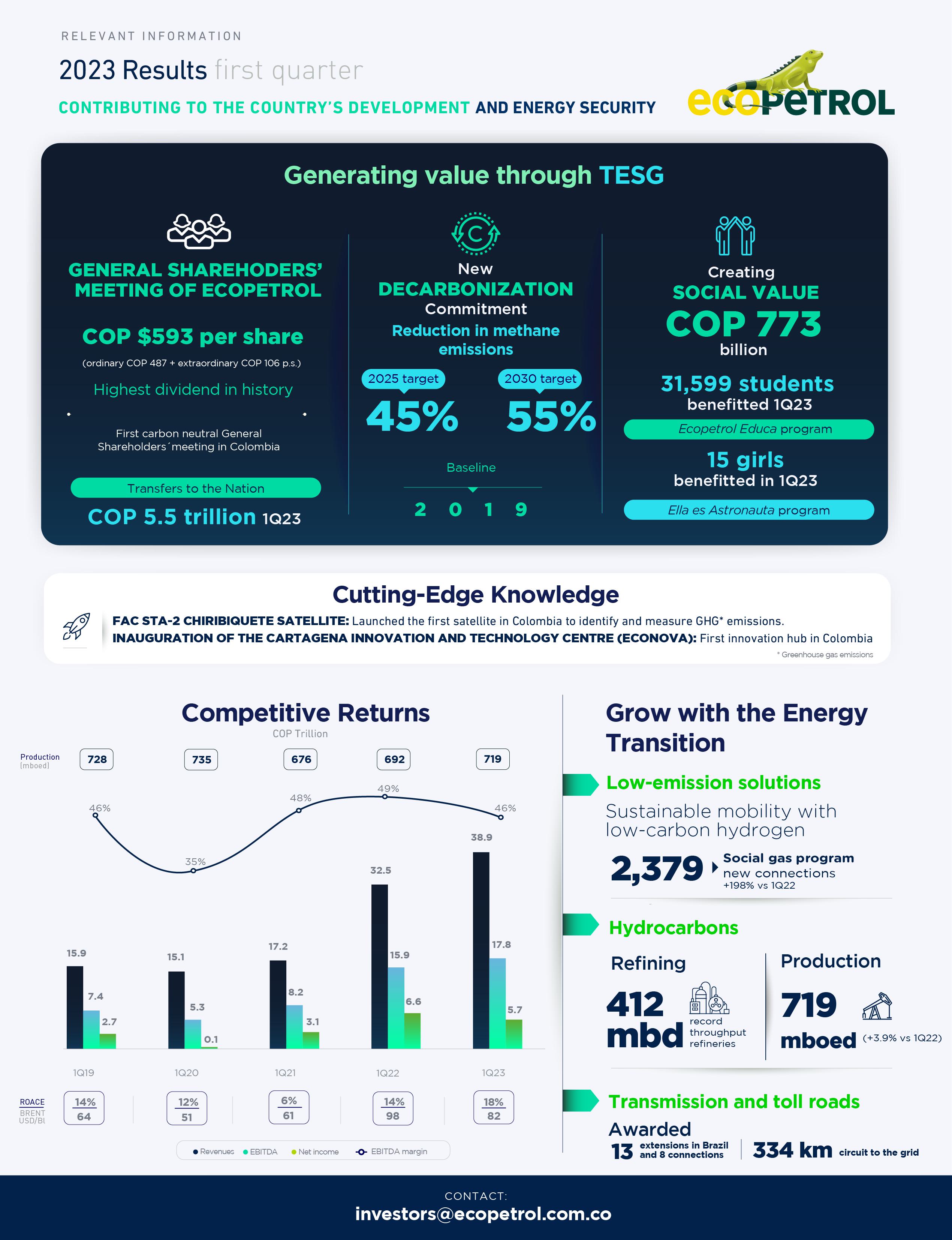 我很荣幸成为Ecopetrol集团的一员。作为一个团队,根据我们为所有利益相关者创造可持续价值的承诺,我们将继续在我们的2040年战略“转变的能源”框架内建立公正的能源转型。我的优先事项将侧重于在我们迈向能源转型时保持价值创造,确保安全运营,同时始终优先考虑生命、最佳和高效的资源管理、透明度以及所有运营的可持续性。 与2022年第一季度相比,我们在2023年初录得强劲的运营和财务状况。在第一季度,我们录得总收入38.9万亿COP,净收入5.7万亿COP,EBITDA 17.8万亿COP和46%的EBITDA利润率。这些结果是在以下情况下取得的:一)鉴于货币贬值,布伦特原油价格上涨,折算成哥伦比亚比索;二)碳氢化合物业务部门运营稳健,产量和运输量增加;三)卡塔赫纳炼油厂的吞吐能力提高;四)输电和收费公路部门表现出色,继续走上稳健且不断增长的增长道路。总债务/EBITDA比率为1.5倍,使用资本回报率(ROACE)为17.8%。 在碳氢化合物业务方面,公司强劲的经营业绩得益于产量、炼油利润率和运输量较2022年第一季度的增长。勘探活动始于2023年,增加了两口新的成功油井,即位于C ó rdoba省的Arrecife Norte-1井,表明Ci é naga de Oro地层存在天然气,以及位于Casanare省的Tororoi-1井,证实存在轻质原油。这些油井是在2022年钻探的,并在本季度完成了初步测试。截至3月底,我们钻探了8口探井,比年度目标提前了32%。 尽管在此期间出现了公共秩序状况和第三方的封锁,但本季度的平均产量达到了719.4百万桶,较2022年第一季度同比增长27.3百万桶。Ca ñ o Sur、Permian和Rubiales是对总产量增长贡献最高的资产。在我们的二叠纪资产中,钻探了37口新井,产量达到51.4 mboed(扣除特许权使用费后的净Ecopetrol),比2022年第一季度增加了24.7 mboed。还值得注意的是,二叠纪地区第一个无罐设施的启动,通过消除罐体减少了排放。 |