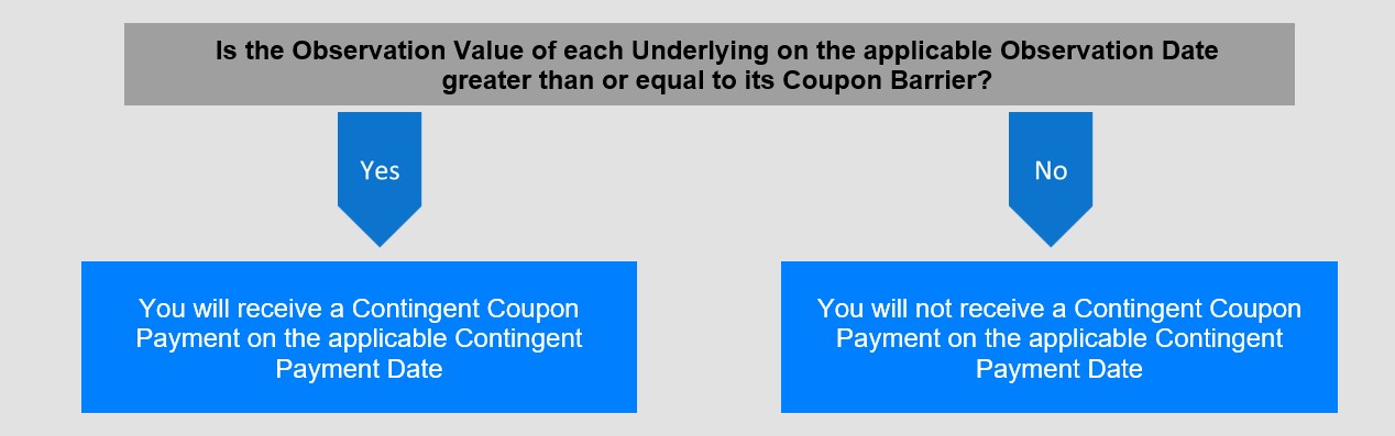 您可能不会收到任何或有息票付款。票据不提供任何定期固定息票支付。票据的投资者不一定会收到票据的任何或有息票付款。如果任何标的在某个观察日的观察值小于其票息障碍,您将不会收到适用于该观察日的或有票息支付。如果在票据期限内的所有观察日,任何标的的观察值均低于其票息壁垒,则在票据期限内,您将不会收到任何或有票息支付,也不会收到票据的正收益。