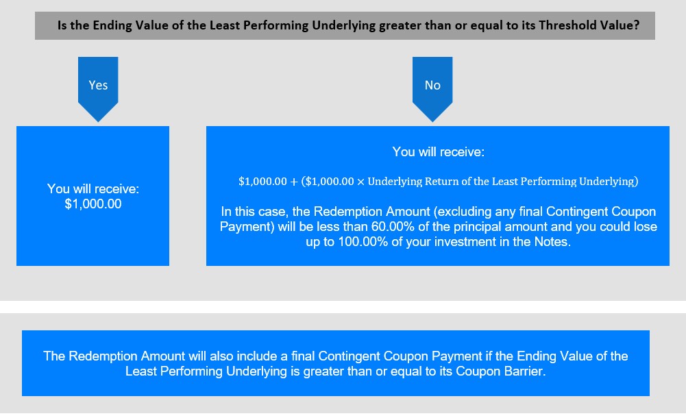 在这种情况下,赎回金额(不包括任何最终或有息票支付)将低于本金额的60.00%,您可能会损失高达100.00%的票据投资。