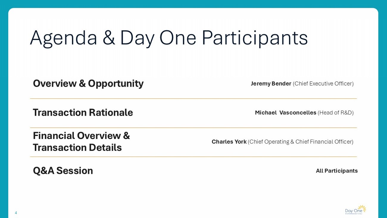 4议程& Day One参与者综述&机会丨Jeremy Bender(首席执行官)交易理由丨首席财务官(研发主管)财务综述&交易详情Charles York(首席运营& TERM3)问答环节所有参与者
