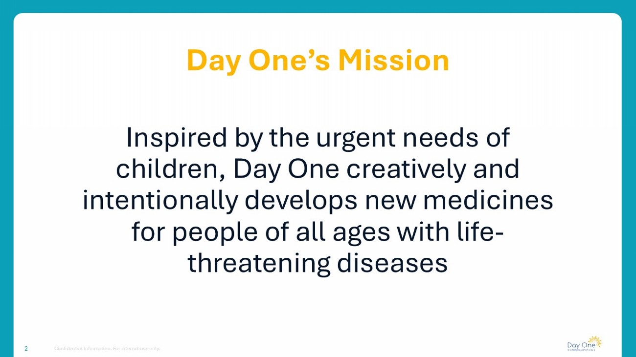 2机密信息。仅供内部使用。Day One的使命在儿童迫切需求的感召下,Day One创造性地、有意识地为各个年龄段有生命危险疾病的人群开发新药