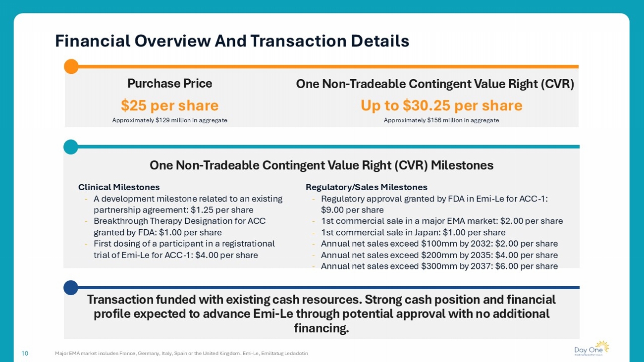 财务概览及交易详情10主要EMA市场包括法国、德国、意大利、西班牙或英国。Emi-Le,Emiltatug Ledadotin以每股25美元的价格购买总计约1.29亿美元的一项不可交易或有价值权(CVR),每股最高为30.25美元。这笔交易的资金总额约为1.56亿美元,来自现有现金资源。强劲的现金状况和财务状况预计将推动Emi-Le通过潜在批准而无需额外融资。临床里程碑-与现有合作协议相关的开发里程碑:每股1.25美元-FDA授予ACC突破性治疗指定:每股1.00美元-启动注册试验ACC:每股4.00美元监管/销售里程碑-FDA在ACC的加速批准:每股9.00美元-主要EMA市场的第一次商业销售:每股2.00美元-日本的第一次商业销售:每股1.00美元-到2032年年度净销售额超过100mm:每股2.00美元-到2035年年度净销售额超过200mm:每股4.00美元-到2037年年度净销售额超过300mm:每股6.00美元一个不可交易的或有价值权(CVR)里程碑