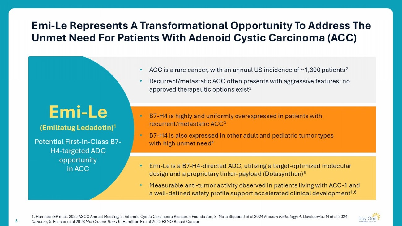 一个令人信服的机会与我们的使命6 ACC,腺样囊性癌一致。Emi-Le,Emiltatug Ledadotin Emi-Le计划加强了我们的使命,为具有变革性影响的创新疗法提供了一个新的机会Day One现有的研发专长和商业能力,能够很好地覆盖服务不足的患者群体,例如ACC我们的使命受到儿童迫切需求的启发,Day One创造性地、有意识地为所有年龄段患有危及生命疾病的人开发新药Emi-Le代表了一种潜在的一流的、针对ACC患者的靶向治疗选择。腺样囊性癌患者没有批准的疗法