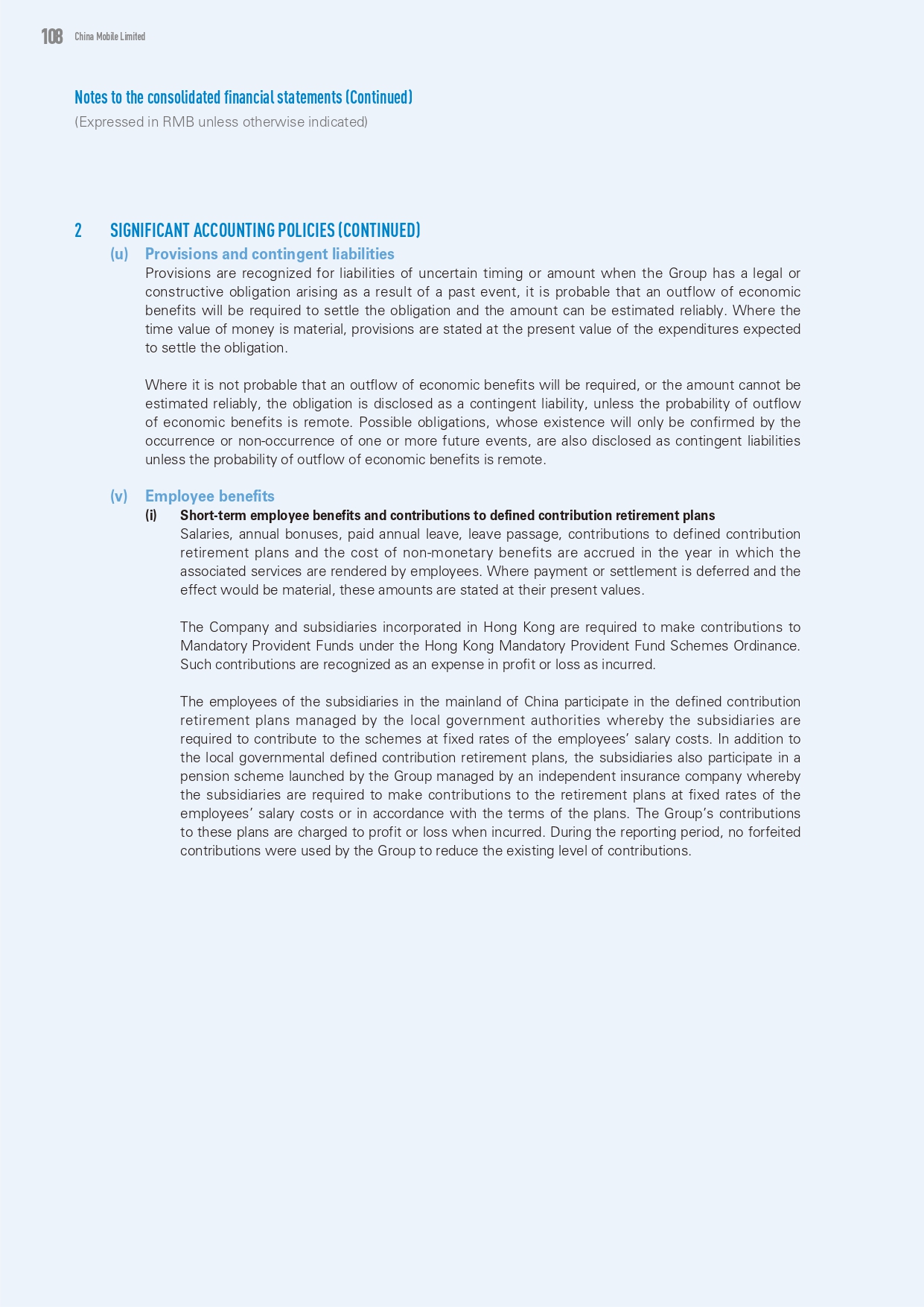 108 中国移动有限公司综合财务报表附注(续)(除另有注明外,以人民币表示)2重要会计政策(续)条文或有负债拨备就时间或金额不确定的负债确认,当本集团因过去的事件而产生法律或推定义务时, 清偿债务很可能需要经济利益的流出,而且可以可靠地估计金额。货币的时间价值是物质的, 准备金按预计清偿债务的支出现值列报。如果不可能要求经济利益外流, 或者不能可靠地估计金额, 该债务披露为或有负债, 除非经济利益外流的可能性很小。可能的义务, 只有在一个或多个未来事件发生或不发生时才能确认其存在, 除非经济利益流出的可能性很小,否则也作为或有负债披露。雇员福利短期雇员福利和固定缴款退休计划缴款薪金, 年度奖金, 带薪年假, 离开通道, 对固定缴款退休计划的缴款和非货币福利的费用在雇员提供相关服务的当年应计。凡延迟付款或结算而其影响重大, 这些数额按其现值列报。根据《香港强制性公积金计划条例》,本公司及在香港成立为法团的附属公司须向强制性公积金供款。此种捐助在发生时确认为费用或损失。中国内地附属公司的雇员参与由当地政府当局管理的界定供款退休计划,而附属公司须按雇员薪金成本的固定费率向该计划供款。除了地方政府的固定缴款退休计划, 附属公司亦参与由一间独立保险公司管理的集团推出的退休金计划,据此,附属公司须按雇员薪金成本的固定费率或按照计划的条款向退休计划供款。本集团对该等计划的供款于产生时记入利润或亏损。在本报告所述期间, 专家组没有利用没收的捐款来减少现有的捐款数额。